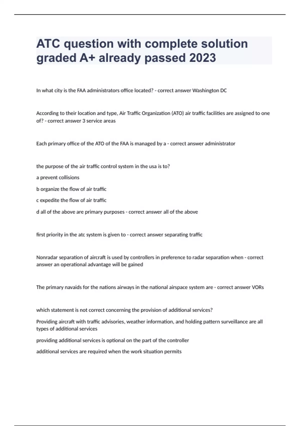 ATC question with complete solution graded A+ already passed 2023 In what city is the FAA administrators office located? - correct answer Washington DC According to their location and type, Air Traffic Organization (ATO) air traffic facilities are assigned to one of? - correct answer 3 service areas Each primary office of the ATO of the FAA is managed by a - correct answer administrator the purpose of the air traffic control system in the usa is to? a prevent collisions b organize the flow of air traffic c expedite the flow of air traffic d all of the above are primary purposes - correct answer all of the above first priority in the atc system is given to - correct answer separating traffic Nonradar separation of aircraft is used by controllers in preference to radar separation when - correct answer an operational advantage will be gained The primary navaids for the nations airways in the national airspace system are - correct answer VORs which statement is not correct concerning the provision of additional services? Providing aircraft with traffic advisories, weather information, and holding pattern surveillance are all types of additional services providing additional services is optional on the part of the controller additional services are required when the work situation permits