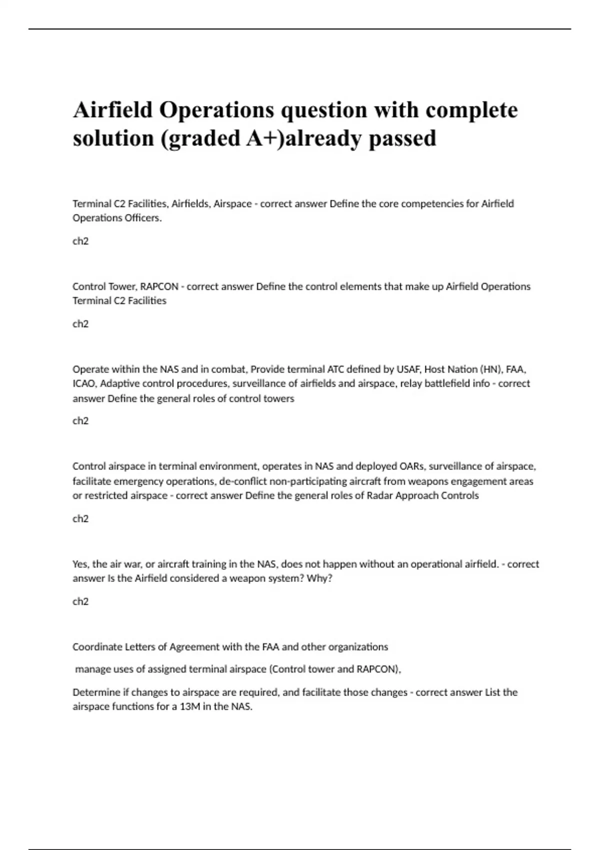 Airfield Operations question with complete solution (graded A+)already passed Terminal C2 Facilities, Airfields, Airspace - correct answer Define the core competencies for Airfield Operations Officers. ch2 Control Tower, RAPCON - correct answer Define the control elements that make up Airfield Operations Terminal C2 Facilities ch2 Operate within the NAS and in combat, Provide terminal ATC defined by USAF, Host Nation (HN), FAA, ICAO, Adaptive control procedures, surveillance of airfields and airspace, relay battlefield info - correct answer Define the general roles of control towers ch2 Control airspace in terminal environment, operates in NAS and deployed OARs, surveillance of airspace, facilitate emergency operations, de-conflict non-participating aircraft from weapons engagement areas or restricted airspace - correct answer Define the general roles of Radar Approach Controls ch2 Yes, the air war, or aircraft training in the NAS, does not happen without an operational airfield. - correct answer Is the Airfield considered a weapon system? Why? ch2 Coordinate Letters of Agreement with the FAA and other organizations manage uses of assigned terminal airspace (Control tower and RAPCON), Determine if changes to airspace are required, and facilitate those changes - correct answer List the airspace functions for a 13M in the NAS.