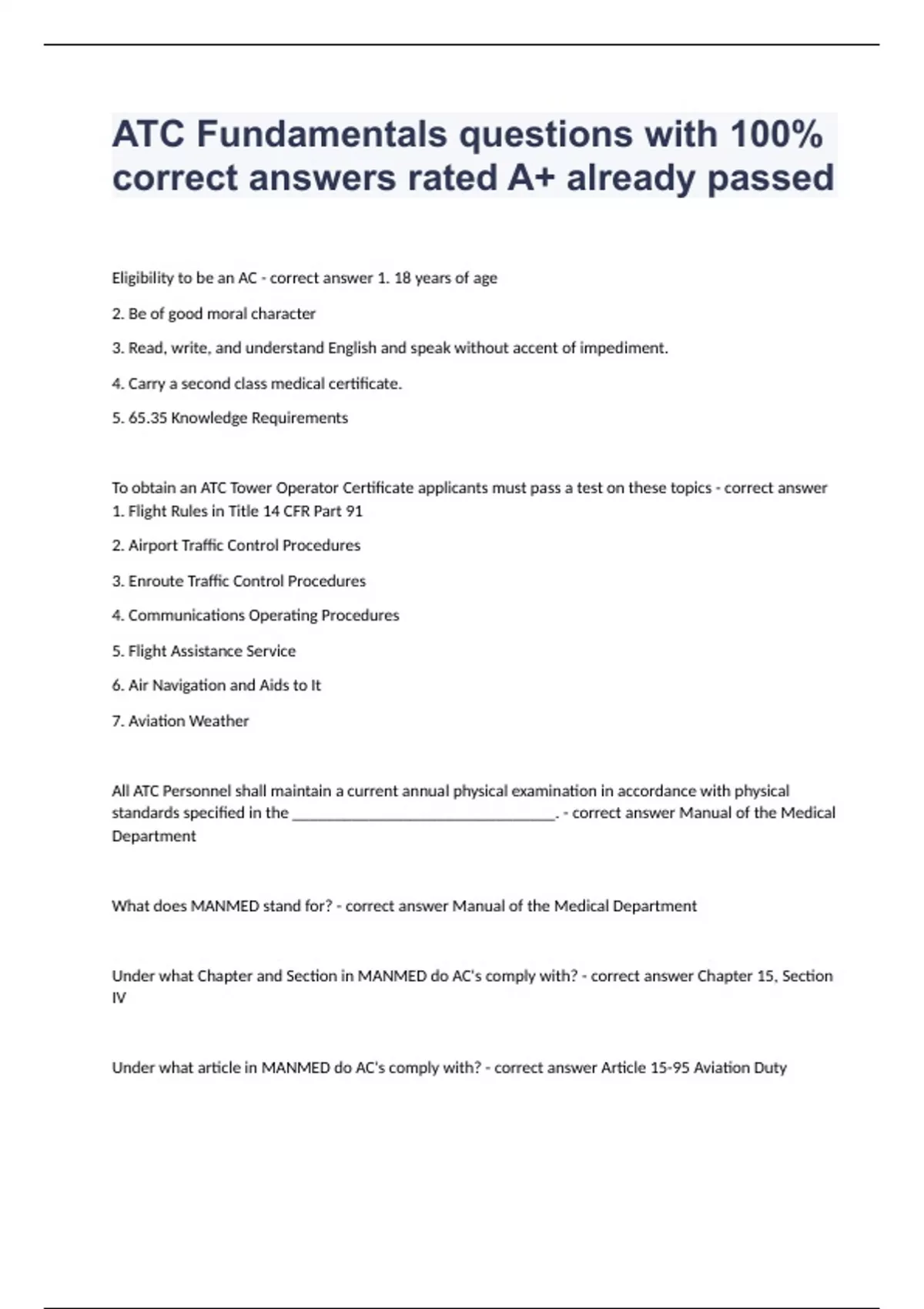 ATC Fundamentals questions with 100% correct answers rated A+ already passed Eligibility to be an AC - correct answer 1. 18 years of age 2. Be of good moral character 3. Read, write, and understand English and speak without accent of impediment. 4. Carry a second class medical certificate. 5. 65.35 Knowledge Requirements To obtain an ATC Tower Operator Certificate applicants must pass a test on these topics - correct answer 1. Flight Rules in Title 14 CFR Part 91 2. Airport Traffic Control Procedures 3. Enroute Traffic Control Procedures 4. Communications Operating Procedures 5. Flight Assistance Service 6. Air Navigation and Aids to It 7. Aviation Weather All ATC Personnel shall maintain a current annual physical examination in accordance with physical standards specified in the _______________________________. - correct answer Manual of the Medical Department What does MANMED stand for? - correct answer Manual of the Medical Department Under what Chapter and Section in MANMED do AC's comply with? - correct answer Chapter 15, Section IV Under what article in MANMED do AC's comply with? - correct answer Article 15-95 Aviation Duty
