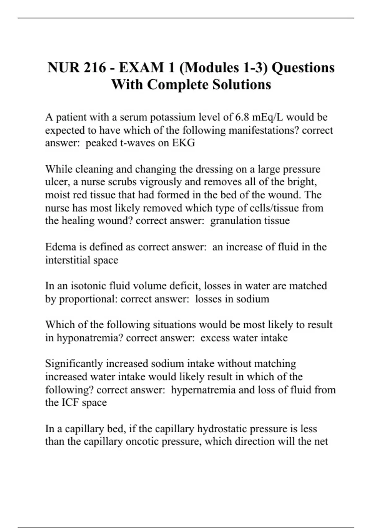 A patient with a serum potassium level of 6.8 mEq/L would be expected to have which of the following manifestations? correct answer: peaked t-waves on EKG While cleaning and changing the dressing on a large pressure ulcer, a nurse scrubs vigrously and removes all of the bright, moist red tissue that had formed in the bed of the wound. The nurse has most likely removed which type of cells/tissue from the healing wound? correct answer: granulation tissue Edema is defined as correct answer: an increase of fluid in the interstitial space In an isotonic fluid volume deficit, losses in water are matched by proportional: correct answer: losses in sodium Which of the following situations would be most likely to result in hyponatremia? correct answer: excess water intake Significantly increased sodium intake without matching increased water intake would likely result in which of the following? correct answer: hypernatremia and loss of fluid from the ICF space In a capillary bed, if the capillary hydrostatic pressure is less than the capillary oncotic pressure, which direction will the net movement of plasma be? correct answer: into the capillary from the ISF Which of the following is a late sign of isotonic fluid v