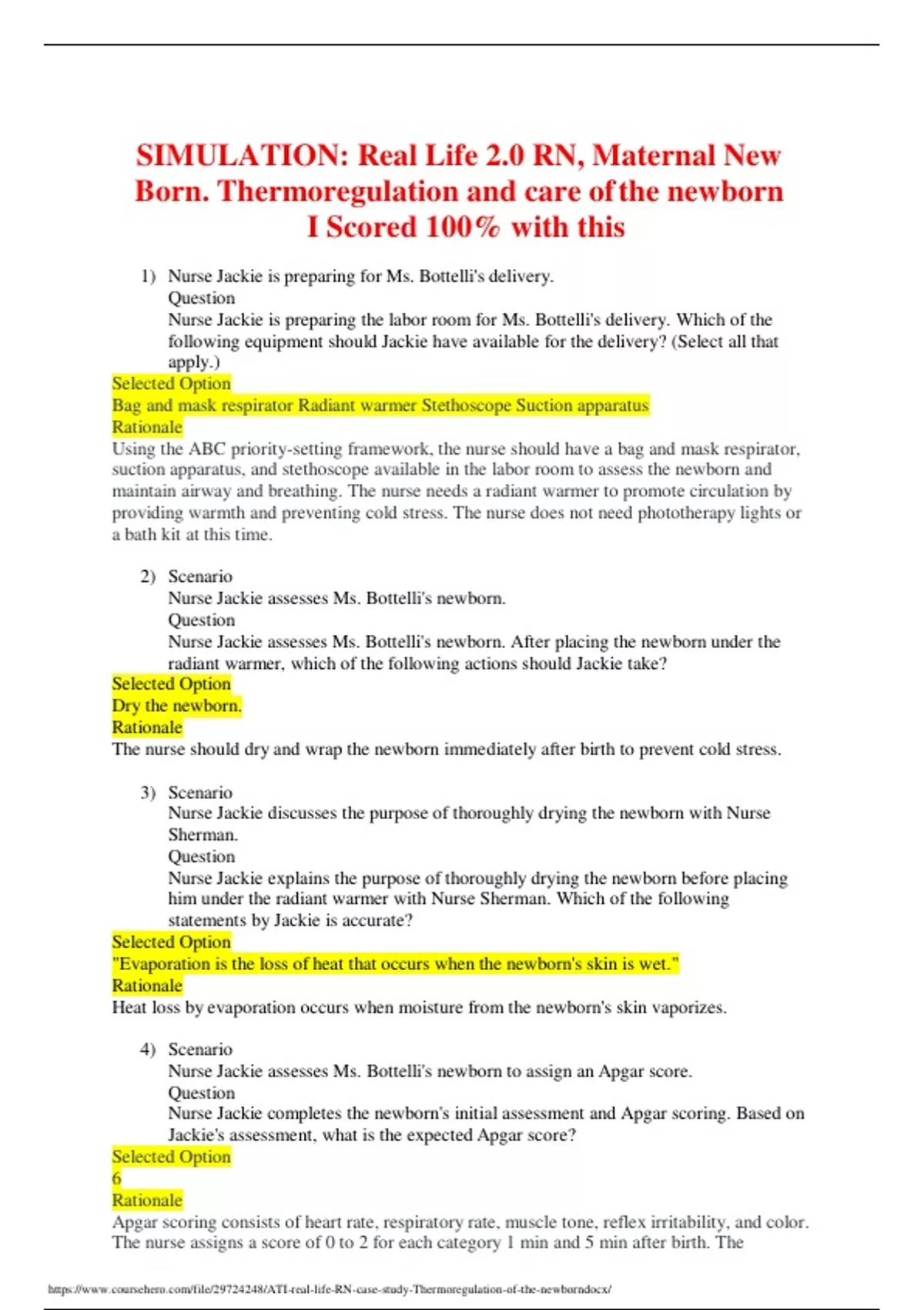 SIMULATION: Real Life 2.0 RN, Maternal New Born. Thermoregulation and care of the newborn I Scored 100% with this 1) Nurse Jackie is preparing for Ms. Bottelli's delivery. Question Nurse Jackie is preparing the labor room for Ms. Bottelli's delivery. Which of the following equipment should Jackie have available for the delivery? (Select all that apply.) Selected Option Bag and mask respirator Radiant warmer Stethoscope Suction apparatus Rationale Using the ABC priority-setting framework, the nurse should have a bag and mask respirator, suction apparatus, and stethoscope available in the labor room to assess the newborn and maintain airway and breathing. The nurse needs a radiant warmer to promote circulation by providing warmth and preventing cold stress. The nurse does not need phototherapy lights or a bath kit at this time. 2) Scenario Nurse Jackie assesses Ms. Bottelli's newborn. Question Nurse Jackie assesses Ms. Bottelli's newborn. After placing the newborn under the radiant warmer, which of the following actions should Jackie take? Selected Option Dry the newborn. Rationale The nurse should dry and wrap the newborn immediately after birth to prevent cold stress. 3) Scenario Nurse Jackie discusses the purpose of thoroughly drying the newborn with Nurse Sherman. Question Nurse Jackie explains the purpose of thoroughly drying the newborn before placing him under the radiant warmer with Nurse Sherman. Which of the following statements by Jackie is accurate? Selected Option "Evaporation is the loss of heat that occurs when the newborn's skin is wet." Rationale Heat loss by evaporation occurs when moisture from the newborn's skin vaporizes. 4) Scenario Nurse Jackie assesses Ms. Bottelli's newborn to assign an Apgar score. Question Nurse Jackie completes the newborn's initial assessment and Apgar scoring. Based on Jackie's assessment, what is the expected Apgar score? Selected Option 6 Rationale Apgar scoring consists of heart rate, respiratory rate, muscle tone, reflex irritability, and color. The nurse assigns a score of 0 to 2 for each category 1 min and 5 min after birth. The This study source was downloaded by from CourseH on :38:07 GMT -05:00 newborn's heart rate was 130/min, which is a score of 2. The respiratory rate was a weak cry that sounded like whimpering with slow and irregular breathing, which is a score of 1. The nurse noted some flexion of the extremities for tone, which is a score of 1. The nurse noted grimacing, which is a score of 1. The newborn had good color in the body with some blue color in the hands and feet, which is a score of 1. The total Apgar score for the newborn totals 6 points. 5) Nurse Jackie notes the newborn's poor respiratory effort and intervenes. Question Nurse Jackie observes the newborn's lack of respiratory effort. Which of the following is the priority nursing action at this time? Selected Option Suction the newborn's mouth using a bulb syringe. Rationale Gentle oropharyngeal suctioning using a bulb syringe is the priority action at this time. 6) Scenario Nurse Sherman and Nurse Jackie are discussing maintaining thermoregulation of the newborn. Question Nurse Sherman and Nurse Jackie are discussing maintaining thermoregulation of the newborn. Which of the following actions should Jackie take to promote thermoregulation? Selected Option Place the newborn directly on the mother's chest. Rationale Skin-to-skin contact and covering the newborn with a warm blanket helps stabilize the newborn's temperature and reduce cold stress. 7) Scenario Nurse Jackie reviews techniques to promote effective breastfeeding and prevent engorgement. Question Nurse Jackie and Ms. Bottelli discuss techniques to promote effective breastfeeding and prevent engorgement. Which of the following should Jackie include in the discussion? Selected Option Breastfeed the newborn approximately 8 to 12 times a day. Rationale Breastfeeding 8 to 12 times a day promotes regular emptying of the breast and prevents engorgement.