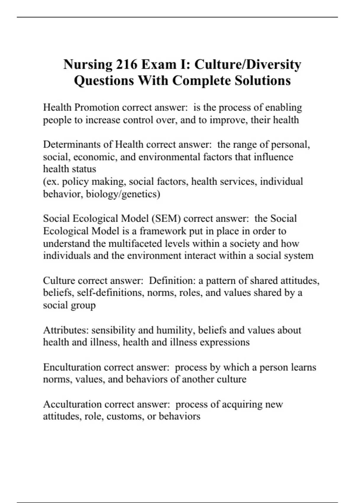 Nursing 216 Exam I: Culture/Diversity Questions With Complete Solutions