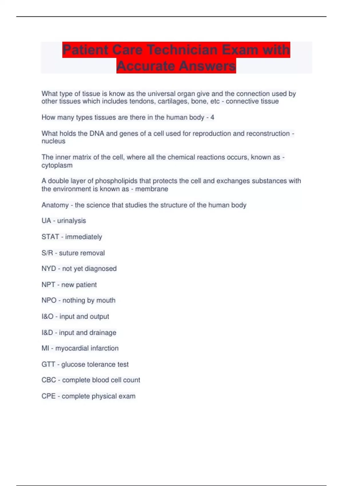 What type of tissue is know as the universal organ give and the connection used by other tissues which includes tendons, cartilages, bone, etc - connective tissue How many types tissues are there in the human body - 4 What holds the DNA and genes of a cell used for reproduction and reconstruction - nucleus The inner matrix of the cell, where all the chemical reactions occurs, known as - cytoplasm A double layer of phospholipids that protects the cell and exchanges substances with the environment is known as - membrane Anatomy - the science that studies the structure of the human body UA - urinalysis STAT - immediately S/R - suture removal NYD - not yet diagnosed NPT - new patient NPO - nothing by mouth I&O - input and output I&D - input and drainage MI - myocardial infarction GTT - glucose tolerance test CBC - complete blood cell count CPE - complete physical exam CHF - congestive heart failure CDC - center of disease control BP - blood pressure WBC - leukocytes/white blood cell count RBC - erythrocytes/red blood cell count C&C - clean catch urine IV - intravenous Three of the following conditions would cause a specimen to be rejected for analysis, which one would not? a) a bilirubin specimen is icteric b) a CBC specimen has clots c) a fasting glucose specimen is lipemic d) an electrolyte specimen is hemolyzed - a heparain prevents blood from clotting by? - inhibiting thrombin which test must be performed on whole blood - CBC STAT electrolytes are run off of what? - serum the avascular layer of the skin is the? - epidermis what color top tube is a ESR drawn in? - lavendar preanalytical phase - the handling of a specimen before it is actually tested hemostasis - condition of clotting of the following laboratory personal, which one is referred to as a clinical laboratory scientist? a) clinical laboratory technician b) medical technologist c) MLT d) phlebotomist - b the third choice (last) vein for vein puncture is the _ vein - basilic which of the following would cause a specimen to be rejected for testing? a) icetric bilirubin specimen b) partially filing red top tube c) potassium specimen on ice d) all are correct - c a white blood cell that stains bright orange is called - eosinophil functions of a CPU include all the following except? a) displaying the processed information on a screen b) instructing the computer to carry out user-requested operations c) managing processing and completion of user-required tasks d) performing logical comparisons of data - a artery of choice for ABE collection is? - radial another name for blood bank - immuno hematology the waves that can be seen on the EKG reflect - depolarization and repolarization a clinical laboratory "path of workflow" is all of the following except: a) defined as the steps necessary to deliver a product or service b) made up of pre analytical, analytical, and post analytical c) monitored throughout the process by quality indicators d) overseen the hospital administrator through periodic reports - d which of the following is the most common arterial puncture complication even when proper technique is used? a) arteriospasm b) hematoma c) infection d) thrombus formation - a AV dissociation occurs most often with - left anterior hemiblock the govt amendment that defines the responsibilities of medical laboratory personnel is the_ law - clia 88 the study of a person's concept and use of space is known as - proxemics a tube with a green stopper normally contains? - thrombin pericardium - fluid found around the heart blood that is flowing back to the heart is known as_ blood - venus H&M - hematocrit/hemaglobin