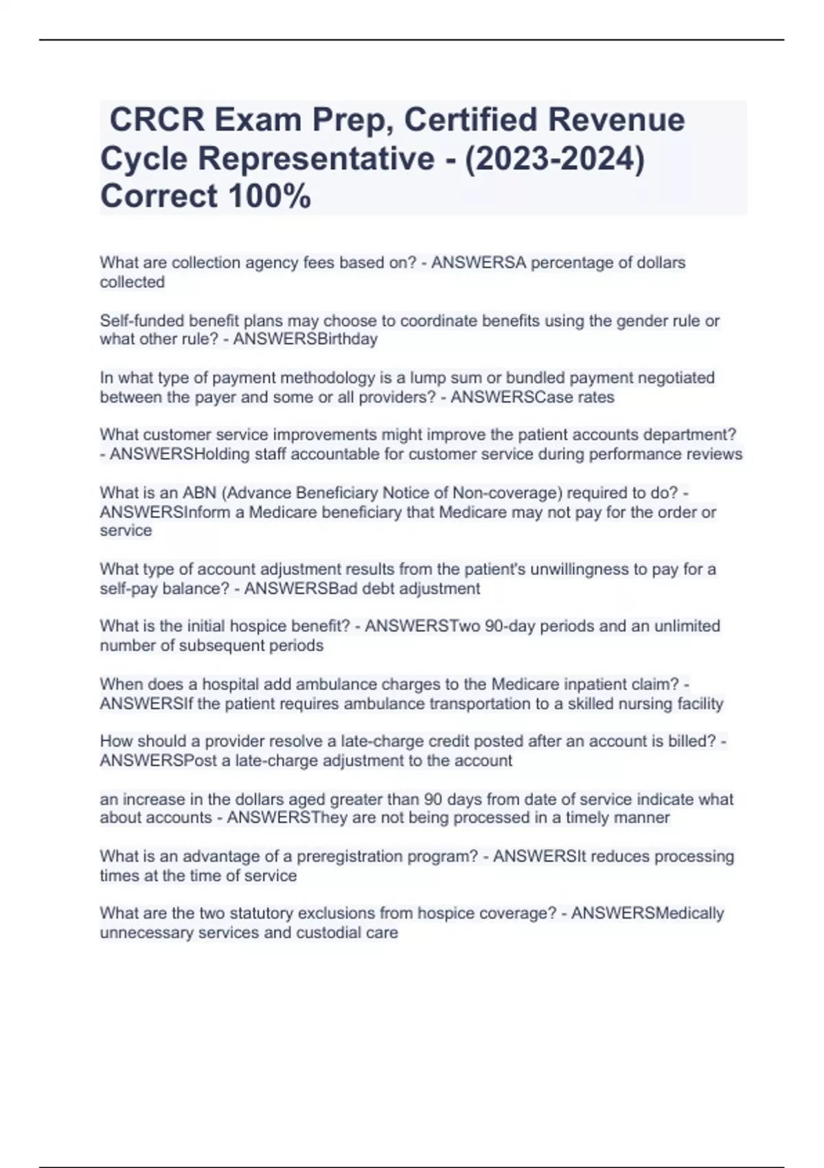 CRCR Exam Prep, Certified Revenue Cycle Representative - () Correct 100%