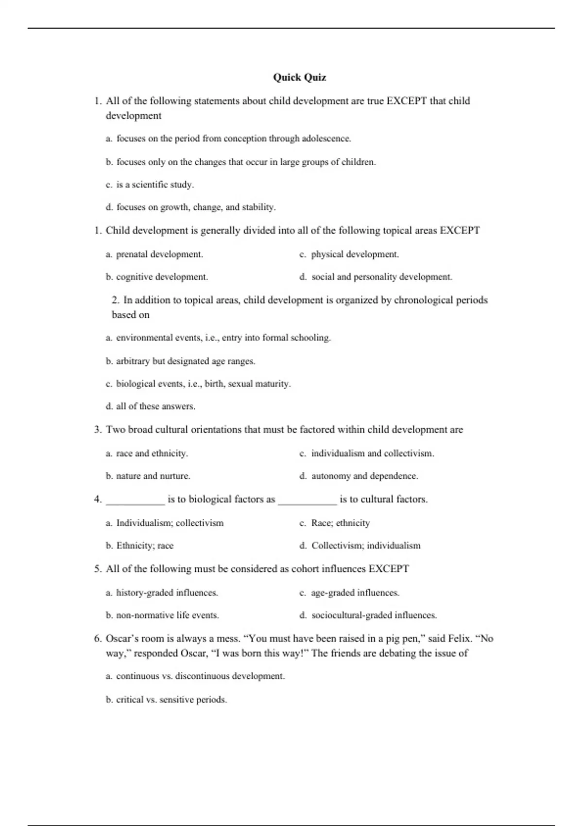 1. Child development is generally divided into all of the following topical areas EXCEPT