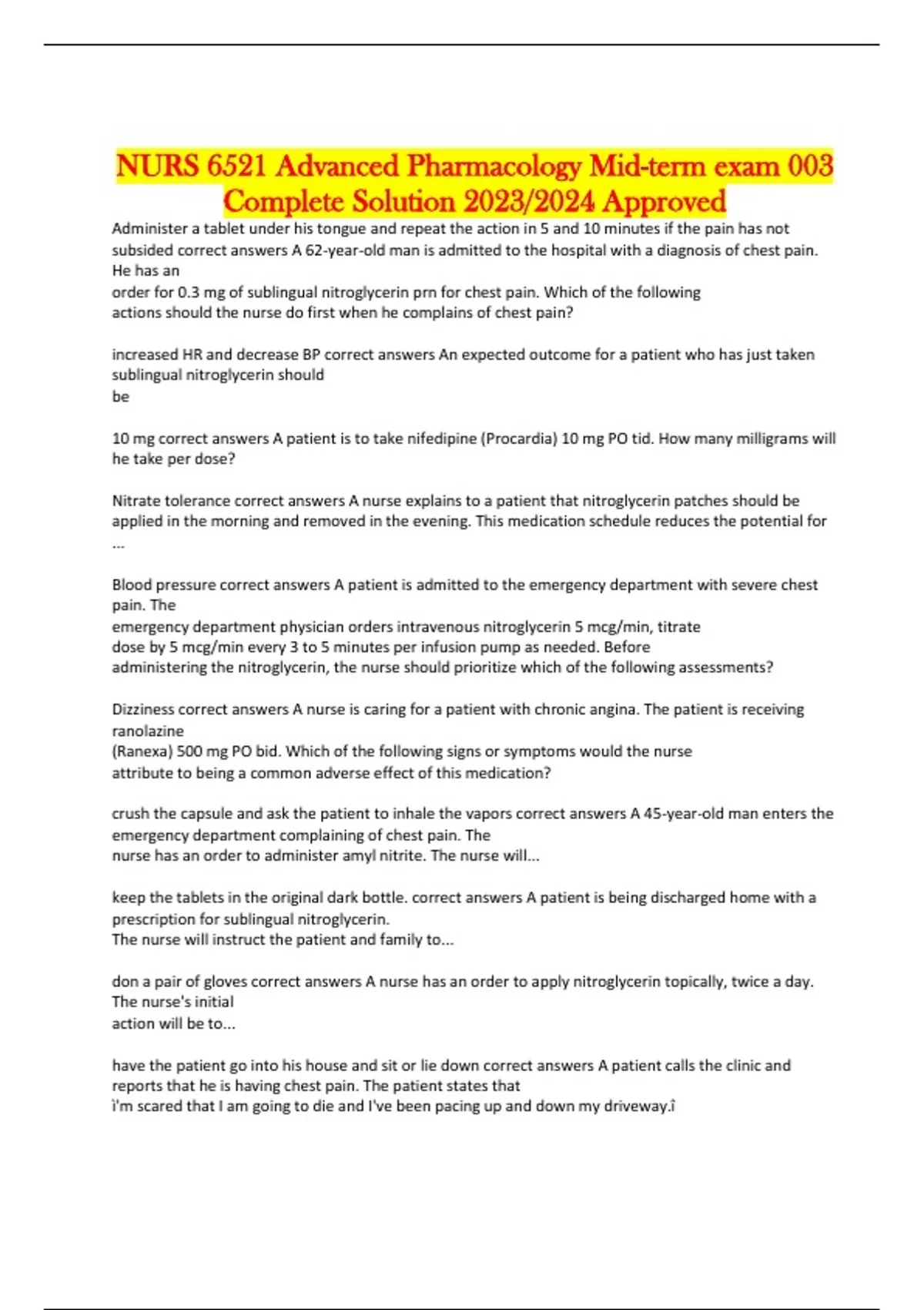 NURS 6521 Advanced Pharmacology Mid-term exam 003 Complete Solution 2023/2024 Approved Administer a tablet under his tongue and repeat the action in 5 and 10 minutes if the pain has not subsided correct answers A 62-year-old man is admitted to the hospital with a diagnosis of chest pain. He has an order for 0.3 mg of sublingual nitroglycerin prn for chest pain. Which of the following actions should the nurse do first when he complains of chest pain? increased HR and decrease BP correct answers An expected outcome for a patient who has just taken sublingual nitroglycerin should be 10 mg correct answers A patient is to take nifedipine (Procardia) 10 mg PO tid. How many milligrams will he take per dose? Nitrate tolerance correct answers A nurse explains to a patient that nitroglycerin patches should be applied in the morning and removed in the evening. This medication schedule reduces the potential for ... Blood pressure correct answers A patient is admitted to the emergency department with severe chest pain. The emergency department physician orders intravenous nitroglycerin 5 mcg/min, titrate dose by 5 mcg/min every 3 to 5 minutes per infusion pump as needed. Before administering the nitroglycerin, the nurse should prioritize which of the following assessments? Dizziness correct answers A nurse is caring for a patient with chronic angina. The patient is receiving ranolazine (Ranexa) 500 mg PO bid. Which of the following signs or symptoms would the nurse attribute to being a common adverse effect of this medication? crush the capsule and ask the patient to inhale the vapors correct answers A 45-year-old man enters the emergency department complaining of chest pain. The nurse has an order to administer amyl nitrite. The nurse will... keep the tablets in the original dark bottle. correct answers A patient is being discharged home with a prescription for sublingual nitroglycerin. The nurse will instruct the patient and family to... don a pair of gloves correct answers A nurse has an order to apply nitroglycerin topically, twice a day. The nurse's initial action will be to... have the patient go into his house and sit or lie down correct answers A patient calls the clinic and reports that he is having chest pain. The patient states that ì'm scared that I am going to die and I've been pacing up and down my driveway.î After calming the patient, the initial instruction by the nurse would be to... The patient's angina may necessitate the use of a calcium channel blocker correct answers A recent episode of chest pain while doing yard work prompted a 70-year-old man to seek care and he has been subsequently diagnosed with chronic stable angina. The nurse should recognize what guiding principle in the treatment of this patient's angina? The woman will be more susceptible to hypotension than a young patient. correct answers Frequent episodes of exercise-related chest pain have caused a 79-year-old woman to use her prescribed nitroglycerin spray several times in recent weeks. This patient's age will have what effect on her use of nitroglycerin? Acute Pain, headache, related to adverse effects of drug therapy correct answers A nurse is creating a plan of care for a 68-year-old woman with a recent diagnosis of unstable angina and new prescription for nitroglycerin. Which of the following nursing diagnoses should the nurse prioritize in the planning of this patient's care? Put your patch on a part of your skin that doesn't have too much hair on it. correct answers A man has left his most recent visit to his primary care provider with a new prescription for a transdermal nitroglycerin patch. What patient education should the nurse provide to this patient? Mr. Penny requires concurrent treatment with a beta blocker, nitrate, or a calcium channel blocker. correct answers Mr. Penny, age 67, was diagnosed with chronic angina several months ago and has been unable to experience adequate relief of his symptoms. As a result, his physician has prescribed ranolazine (Ranexa). Which of the following statements is true regarding the use of ranolazine for the treatment of this patient's angina? Determine if the drug is going to make you drowsy before you drive. correct answers A patient is in the clinic for seasonal allergic rhinitis. Loratadine (Claritin) is prescribed. Which of the following statements will the nurse include when providing patient education concerning this drug? Taking too many laxatives can make your bowels dependent on them, making you more susceptible to constipation. correct answers A 73-year-old woman has scheduled an appointment with her nurse practitioner to discuss her recurrent constipation. The woman states that she experiences constipation despite the fact that she takes docusate on a daily basis and performs cleansing enemas several times weekly. How should the nurse best respond to this patient's statements?