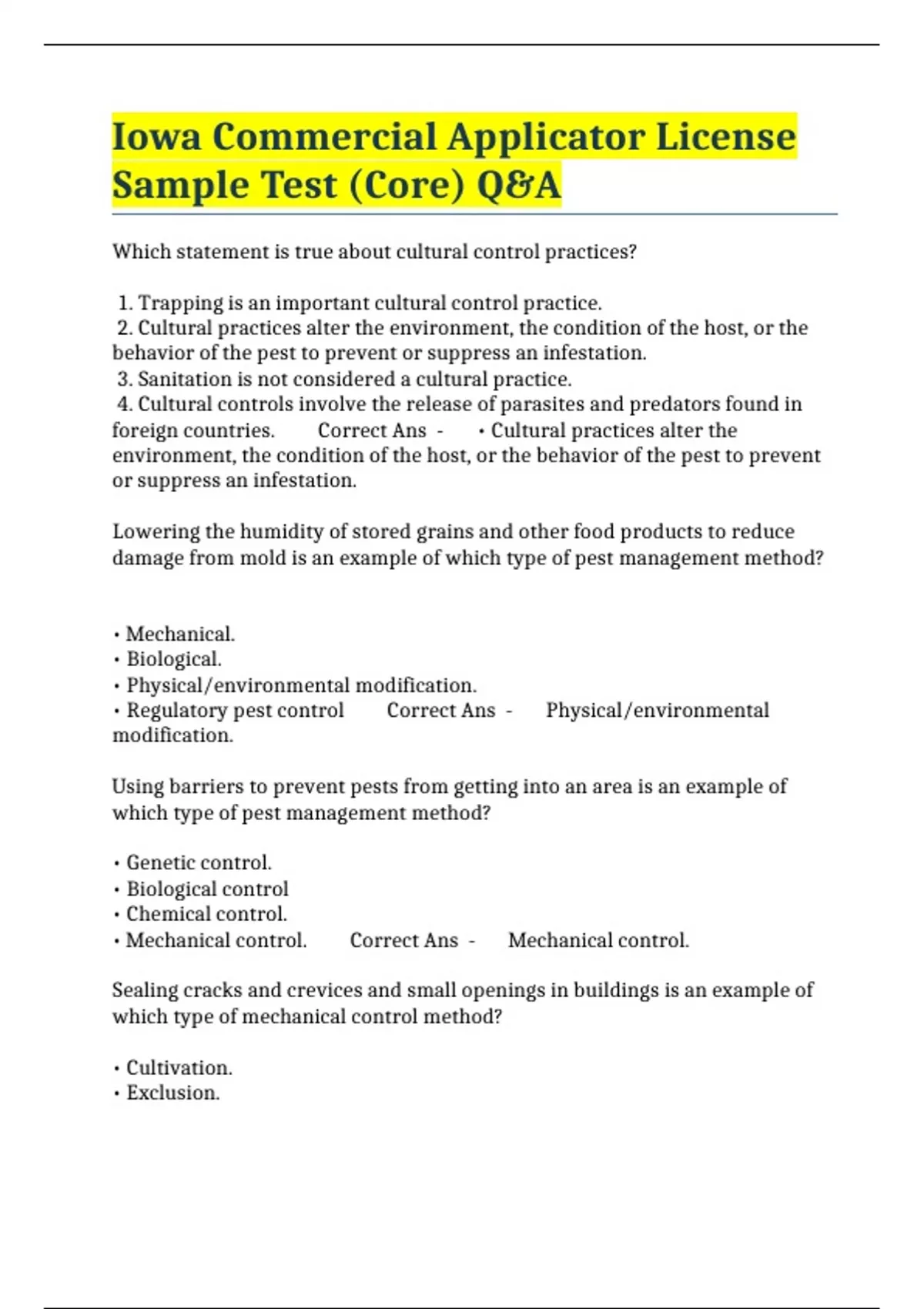 Iowa Commercial Applicator License Sample Test (Core) Q&A
