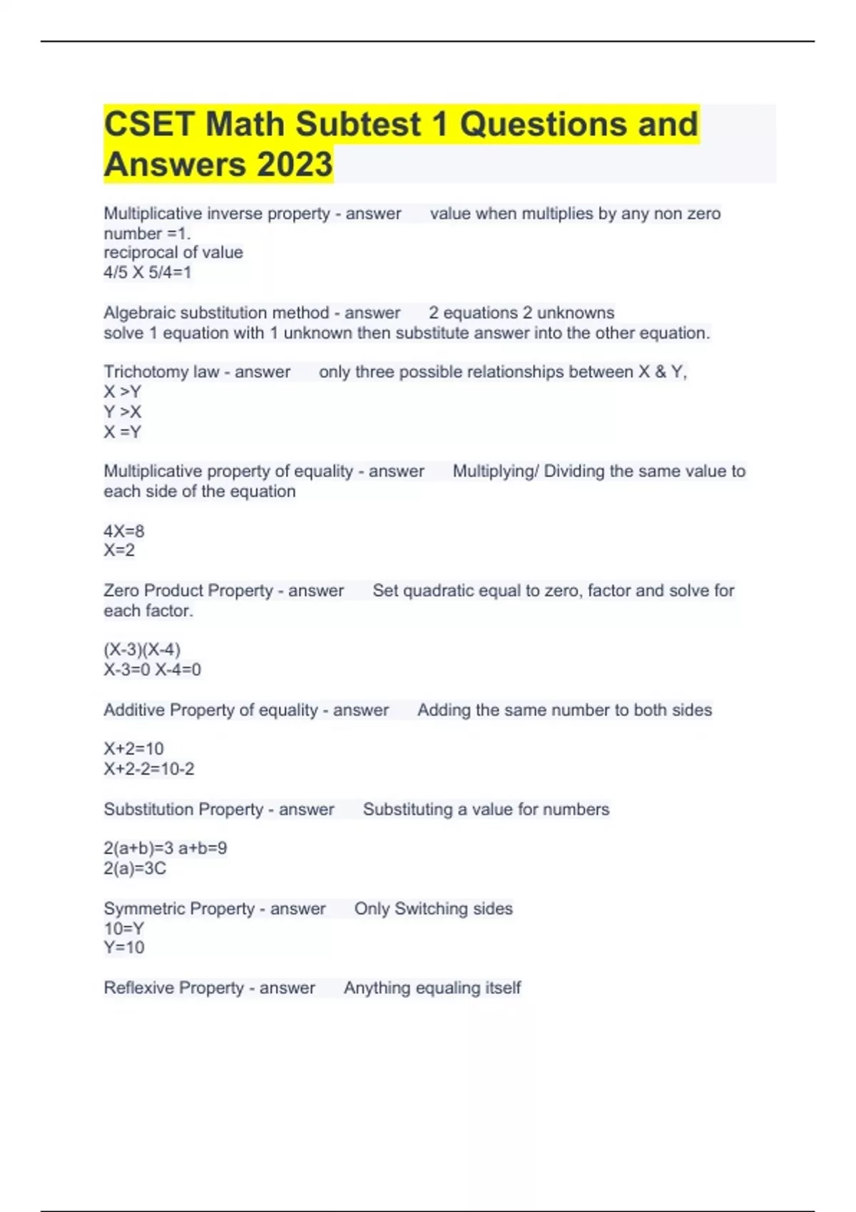 CSET Math Subtest 1 Questions and Answers 2023 Multiplicative inverse property value when multiplies by any non zero number =1. reciprocal of value 4/5 X 5/4=1 Algebraic substitution method 2 equations 2 unknowns solve 1 equation with 1 unknown then substitute answer into the other equation. Trichotomy law only three possible relationships between X & Y, X Y Y X X =Y Multiplicative property of equality Multiplying/ Dividing the same value to each side of the equation 4X=8 X=2 Zero Product Property Set quadratic equal to zero, factor and solve for each factor. (X-3)(X-4) X-3=0 X-4=0 Additive Property of equality Adding the same number to both sides X+2=10 X+2-2=10-2 Substitution Property Substituting a value for numbers 2(a+b)=3 a+b=9 2(a)=3C Symmetric Property Only Switching sides 10=Y Y=10 Reflexive Property Anything equaling itself 7Y=7Y Multiplicative Identity Multiplied and didn't change anything 5X1=5 Additive Identity The sum of any number and zero is the original number 5+0=0 Distributive Property Multiplying through a parenthesis a(a+b)=ab+ac Associative Property Regrouping a+(b+c)= (a+b)+c Commutative Property Move Around a+b=b+a ab=ba Factors Numbers you can multiply together to get another number. Composite Number A whole number that can be divided by numbers other than 1 and itself. Prime Number A whole greater than 1 whose only 2 whole factors are 1 and itself. How to find the probability of an event Fraction: Number of favorable outcomes possible __________________________________________ Total possible outcomes Percent Increase formula Fraction: Difference between percents _______________________________ X 100= % Increase Starting Point Median Middle value No middle, take average of two middle values. Median is in the middle of the freeway. Range Difference between highest and lowest values Mode Value that happens most frequently The most frequently used mode of transportation is a car. Mean Average Don't be mean because you're average. If a line joining 2 points is vertical the slope is Undefined or no slope Slope Formula (Y2-Y1) _______ (X2-X1) If a line joining 2 points is horizontal the slope is: Zero If a line joining 2 points goes down and to the right the slope is Negative If a line joining 2 points goes up and to the right the slope is Positive Slope Definition Vertical change/ Horizontal Change Rise/Run Algebraic elimination method Either add/subtract the same number to each equation to eliminate a variable. Radius Half the diameter Distance from center of circle to the circle. Diameter Length of the circle from edge to edge. Area of a circle A=πr² π Value 3.14 Integer Whole number not a fraction or fractional component Rational Number Ratio=Fraction Can be positive or negative Least Common Multiple Comparing 2 values Multiply each value to find the smallest value they have in common. Additive Inverse Property A value when added to any number = 0 1+(-1)=0 Opposite of number Identity numbers Property A value when added/multiplied to another number doesn't change the value. Addition = 0 3+0=3 Multiplication = 1 3X1=3 Distributive Property Multiplying through parenthesis Multiplication outside parenthesis distributed over either add/sub inside parenthesis. 3(5+2) = 3(5)+3(2) Associative Property Regrouping in same order 8+(4+2)=(8+4)+2 Not division or multiplication Commutative Property Commute-move around The order in which add/mult is done and doesn't effect answer. a+b=b+a aXb=bXa Can't be subtraction or division What are the metric terms in order smallest to largest milli= 1/1000 centi= 1/100 deci= 1/10 meter/liter/gram = 1 deca= 10 hecto=100 kilo=1000 1 bushel = how many peck 4 pecks 1 gallon = how many quarts 4 quarts 1 quart = how many pints 2 pints 1 pint = how many cups 2 cups 1 ton = how many pounds 2,000 pounds 1 mile = how many feet 5280 feet 1 mile = how many yards 1760 yards Composite Number Not a prime number composed of multiples Prime Number Number who only has 1 and itself and multiples Real Number All the rational and irrational numbers