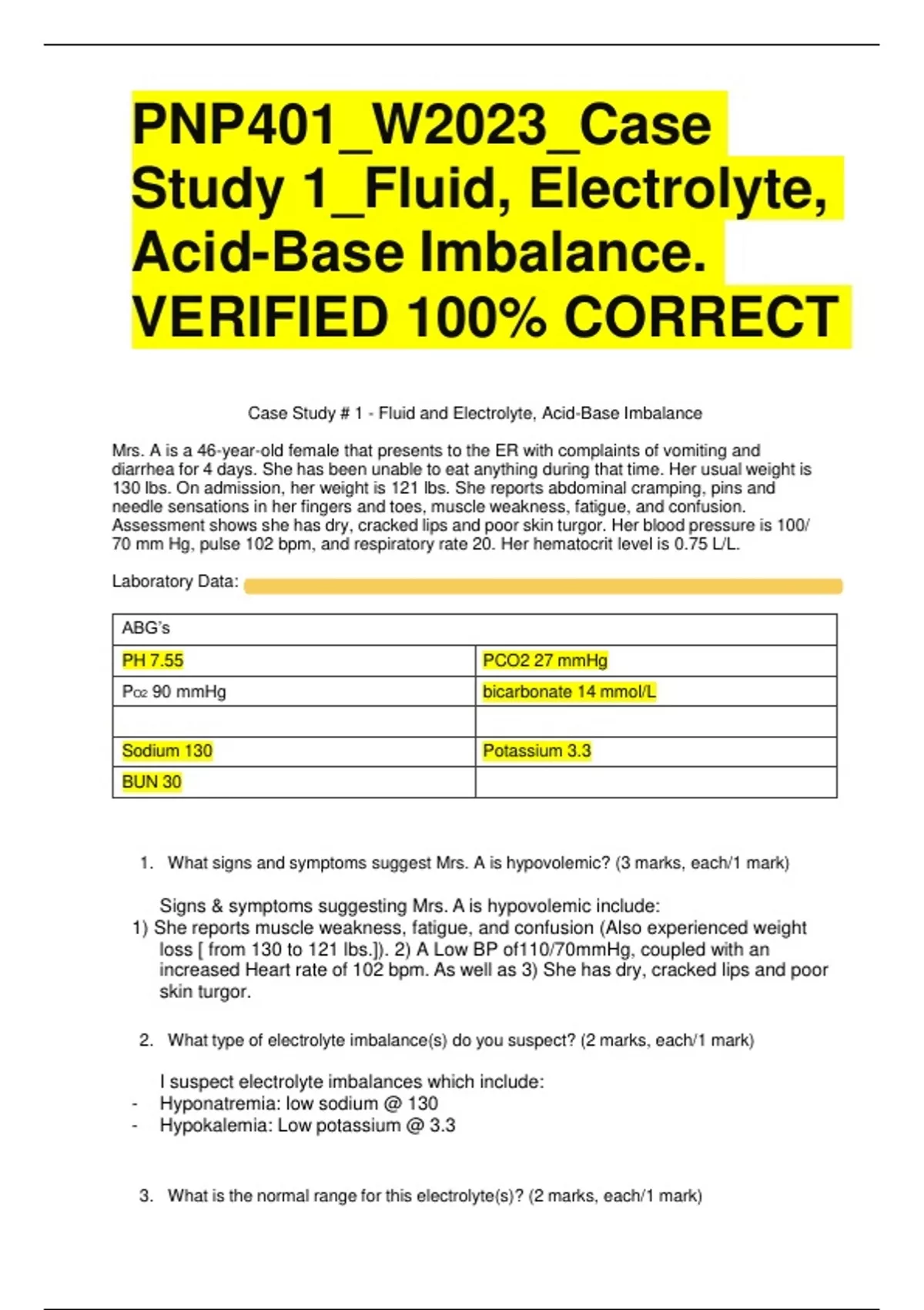 PNP401_W2023_Case Study 1_Fluid, Electrolyte, Acid-Base Imbalance. VERIFIED 100% CORRECT