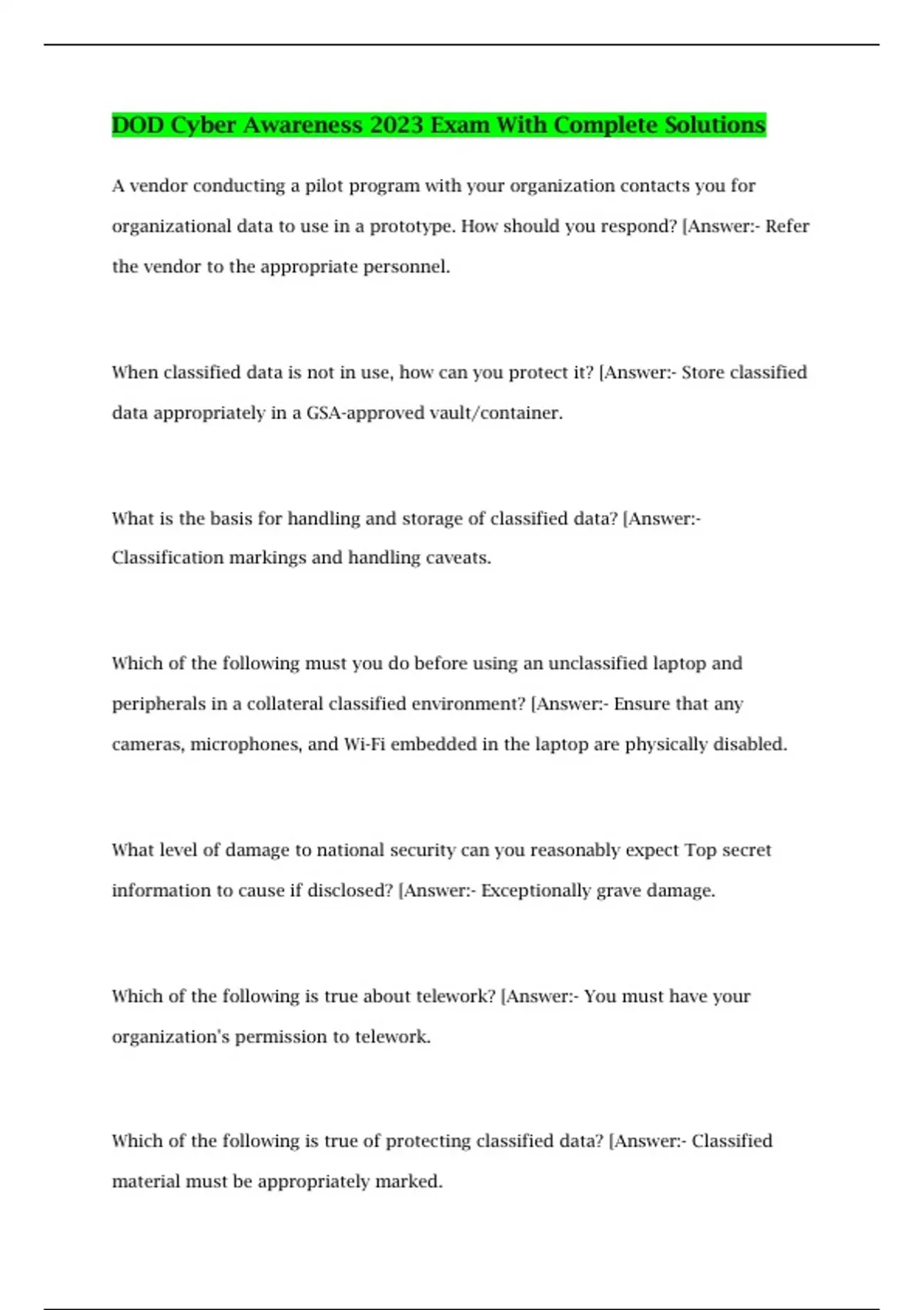 DOD Cyber Awareness 2023 Exam With Complete Solutions A vendor conducting a pilot program with your organization contacts you for organizational data to use in a prototype. How should you respond? [Answer:- Refer the vendor to the appropriate personnel. When classified data is not in use, how can you protect it? [Answer:- Store classified data appropriately in a GSA-approved vault/container. What is the basis for handling and storage of classified data? [Answer:- Classification markings and handling caveats. Which of the following must you do before using an unclassified laptop and peripherals in a collateral classified environment? [Answer:- Ensure that any cameras, microphones, and Wi-Fi embedded in the laptop are physically disabled. What level of damage to national security can you reasonably expect Top secret information to cause if disclosed? [Answer:- Exceptionally grave damage.