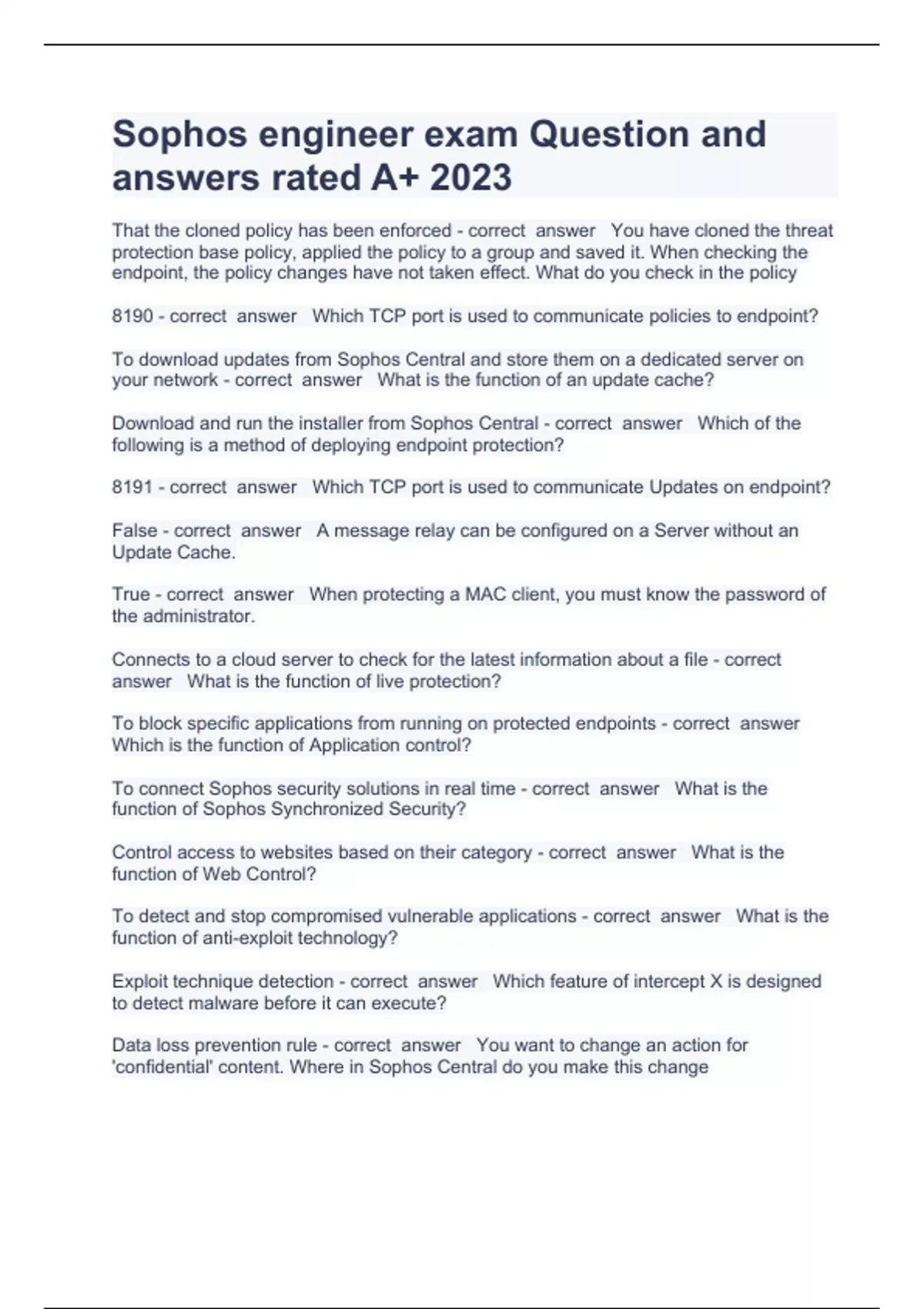 Sophos engineer exam Question and answers rated A+ 2023 That the cloned policy has been enforced - correct answer You have cloned the threat protection base policy, applied the policy to a group and saved it. When checking the endpoint, the policy changes have not taken effect. What do you check in the policy 8190 - correct answer Which TCP port is used to communicate policies to endpoint? To download updates from Sophos Central and store them on a dedicated server on your network - correct answer What is the function of an update cache? Download and run the installer from Sophos Central - correct answer Which of the following is a method of deploying endpoint protection? 8191 - correct answer Which TCP port is used to communicate Updates on endpoint? False - correct answer A message