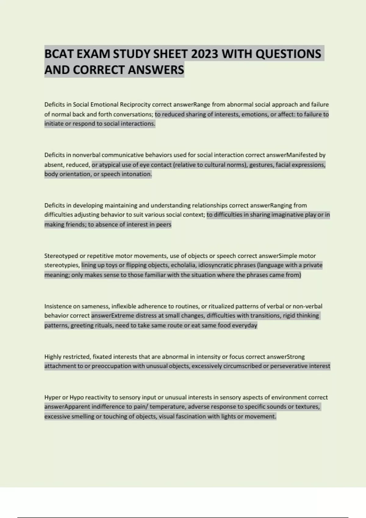 bcat exam study sheet 2023 with questions and corr