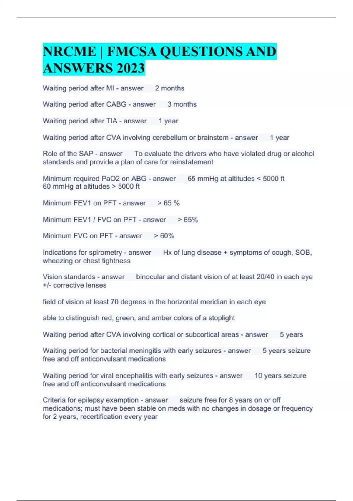 NRCME | FMCSA QUESTIONS AND ANSWERS 2023 Waiting period after MI 2 months Waiting period after CABG 3 months Waiting period after TIA 1 year Waiting period after CVA involving cerebellum or brainstem 1 year Role of the SAP To evaluate the drivers who have violated drug or alcohol standards and provide a plan of care for reinstatement Minimum required PaO2 on ABG 65 mmHg at altitudes 5000 ft 60 mmHg at altitudes 5000 ft Minimum FEV1 on PFT 65 % Minimum FEV1 / FVC on PFT 65% Minimum FVC on PFT 60% Indications for spirometry Hx of lung disease + symptoms of cough, SOB, wheezing or chest tightness Vision standards binocular and distant vision of at least 20/40 in each eye +/- corrective lenses field of vision at least 70 degrees in the horizontal meridian in each eye able to distinguish red, green, and amber colors of a stoplight Waiting period after CVA involving cortical or subcortical areas 5 years Waiting period for bacterial meningitis with early seizures 5 years seizure free and off anticonvulsant medications Waiting period for viral encephalitis with early seizures 10 years seizure free and off anticonvulsant medications Criteria for epilepsy exemption seizure free for 8 years on or off medications; must have been stable on meds with no changes in dosage or frequency for 2 years, recertification every year Waiting period for single, unprovoked seizure 5 years seizure free and off anticonvulsants Waiting period for moderate TBI with early seizures 5 years seizure free and off anticonvusants Waiting period for moderate TBI without early seizures 2 years seizure free and off anticonvulsants Waiting period for mild TBI with early seizures 2 years seizure free and off anticonvulsants Waiting period for Benign Paroxysmal Positional Vertigo 2 months asymptomatic Waiting period for acute and chronic peripheral vesibulopathy 2 months asymptomatic Waiting period after heart transplant 1 year Max certification period post heart transplant 6 months Waiting period after aneurysm repair 3 months Certification criteria for atrial fibrillation on warfarin/coumadin Waiting time: 1 month (stabilized on meds) INR: monthly Certify: 1 year Requirements to certify AAA 4 cm aneurysm and asymptomatic or 4-5 cm and asymptomatic and cleared by cardiology Disqualification criteria for AAA symptomatic, recommendations for surgical repair regardless of size, 4-5 cm without cardiology clearance, 5 cm, or increase in aneurysm size by 0.5 cm or more during a 6 month period regardless of size Waiting period after ECT 6 months; Maintenance or ongoing ECT for depression is not certifiable. Minimum gross vehicle weight that will require a DOT medical exam for the driver 10,001 lbs Assessment of L4 nerve root pathology Patellar reflex Mood disorder waiting period 6 months symptom free following a nonpsychotic major depression unaccompanied by suicidal behavior Minimum is 1 year symptom free following a severe depressive episode, a suicide attempt, or a manic episode Commercial motor vehicle any self-propelled or towed motor vehicle used on a highway in interstate commerce to transport passengers or property when the vehicle: (1) Has a combined gross vehicle weight or weight rating of 10,001 pounds or more; (2) Is designed or used to transport more than eight passengers (including the driver)for compensation; or Is designed or used to transport more than 15 passengers, including the driver, and is not used to transport passengers for compensation; or Transports hazardous materials in quantities that require placards under the hazardous materials regulations Max certification period for lithium treatment 1 year HgbA1C above what level indicates poor control of diabetes? 10% Maximum certification period and certification criteria for allergy-related life threatening condition 2 years for persons who has an effective treatment regimen and successful preventive measures Non-driving duties of CMV driver Use side mirrors. Control 24" steering wheel Manipulate dashboard switches and controls Shift gears Enter and exit the vehicle (Hip angle and knee flexion may both have to exceed 90 degrees) Couple and uncouple trailers Load, secure, and unload cargo Perform vehicle checks post-procedure waiting period after uncomplicated, elective percutaneous coronary intervention procedure to treat stable angina 1 week Waiting period for unstable angina 3 months with no rest angina or change in angina pattern Dip urinalysis should include the following parameters Specific gravity Protein Blood Glucose Certification guidelines for driver who is being treated for ADHD with a central nervous system stimulant no waiting period provided the medication has been proven to be safe and effective with no side-effects for the driver and may be certified for up to one year Minimum LVEF on echocardiogram 40% How long is the certification period for a driver who has a vision exemption, and for how long is the exemption valid? Certification for a driver with a vision exemption is annual and the driver must reapply for the exemption every 2 years. In order for the driver to obtain a vision exemption, the medical examiner must: Provide the driver the medical certification card and long form, both marked "certified for 1 year" and also marked "accompanied by a vision waiver/exemption". The driver must have both the medical certification card and long form to apply for a vision exemption marked "certified for 1 year" (required for all with a vision exemption), and "accompanied by a vision exemption" on each form. The exemption is good for 2 years, even though the certification is limited to 1 year. It is the driver's responsibility to re-apply and present the exemption at the time of the examination for each re-certification. FMCSA's mission reduce crashes, injuries and fatalities involving large trucks and buses. Develop and enforce data-driven regulations that balance motor carrier (truck and bus companies) safety with industry efficiency. Target educational