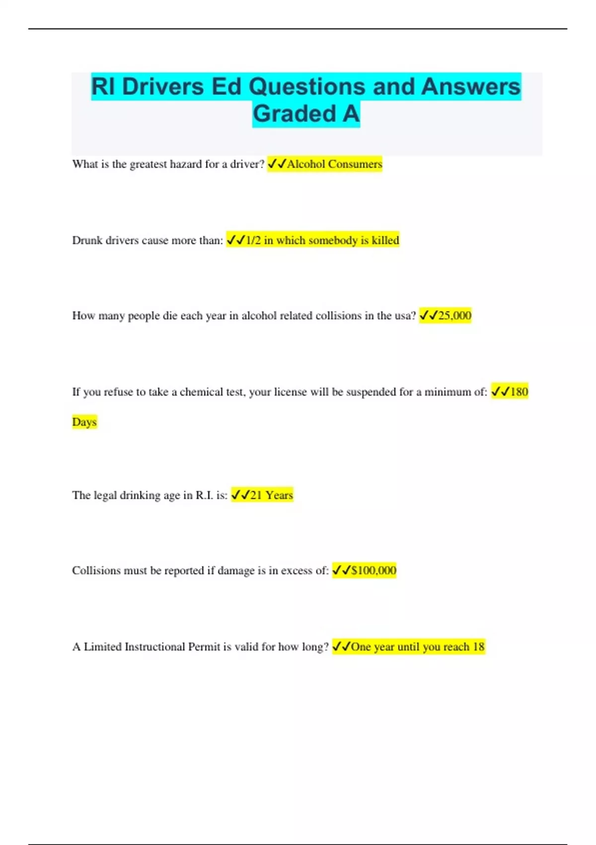 RI Drivers Ed Questions and Answers Graded A