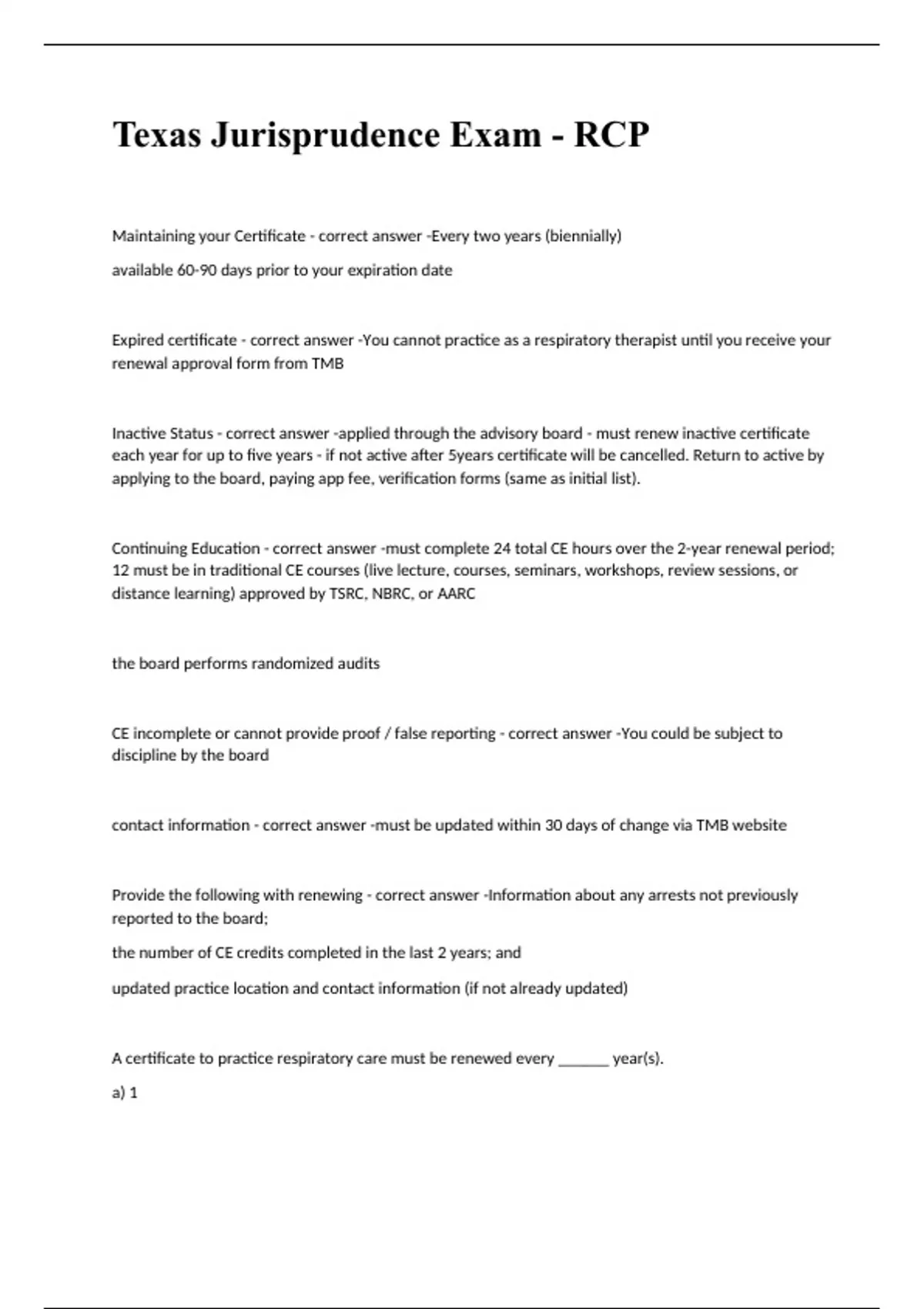 Maintaining your Certificate Every two years (biennially) available 60-90 days prior to your expiration date Expired certificate You cannot practice as a respiratory therapist until you receive your renewal approval form from TMB Inactive Status applied through the advisory board - must renew inactive certificate each year for up to five years - if not active after 5years certificate will be cancelled. Return to active by applying to the board, paying app fee, verification forms (same as initial list). Continuing Education must complete 24 total CE hours over the 2-year renewal period; 12 must be in traditional CE courses (live lecture, courses, seminars, workshops, review sessions, or distance learning) approved by TSRC, NBRC, or AARC the board performs randomized audits CE incomplete or cannot provide proof / false reporting You could be subject to discipline by the board contact information must be updated within 30 days of change via TMB website Provide the following with renewing Information about any arrests not previously reported to the board; the number of CE credits completed in the last 2 years; and updated practice location and contact information (if not already updated) A certificate to practice respiratory care must be renewed every ______ year(s). a) 1 b) 5 c) 2 d) 3 c) 2 years A respiratory care practitioner certificate which has been on inactive status for ____ year(s) will be canceled. a) 1 b) 5 c) 2 d) 10 b) 5 years