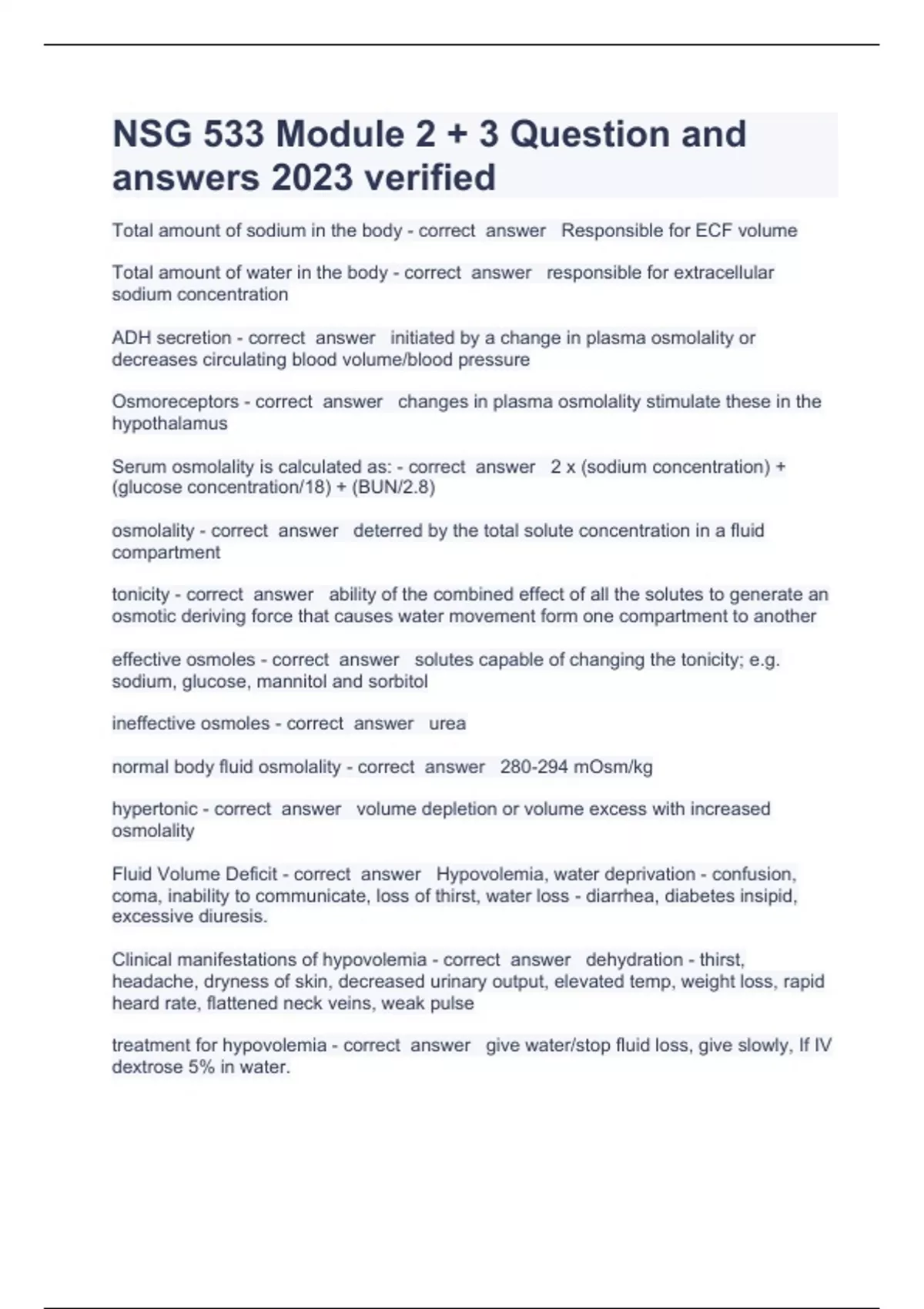 NSG 533 Module 2 + 3 Question and answers 2023 verified Total amount of sodium in the body - correct answer Responsible for ECF volume Total amount of water in the body - correct answer responsible for extracellular sodium concentration ADH secretion - correct answer initiated by a change in plasma osmolality or decreases circulating blood volume/blood pressure Osmoreceptors - correct answer changes in plasma osmolality stimulate these in the hypothalamus Serum osmolality is calculated as: - correct answer 2 x (sodium concentration) + (glucose concentration/18) + (BUN/2.8) osmolality - correct answer deterred by the total solute concentration in a fluid compartment tonicity - correct answer ability of the combined effect of all the solutes to generate an osmotic deriving force that causes water movement form one compartment to another effective osmoles - correct answer solutes capable of changing the tonicity; e.g. sodium, glucose, mannitol and sorbitol ineffective osmoles - correct answer urea