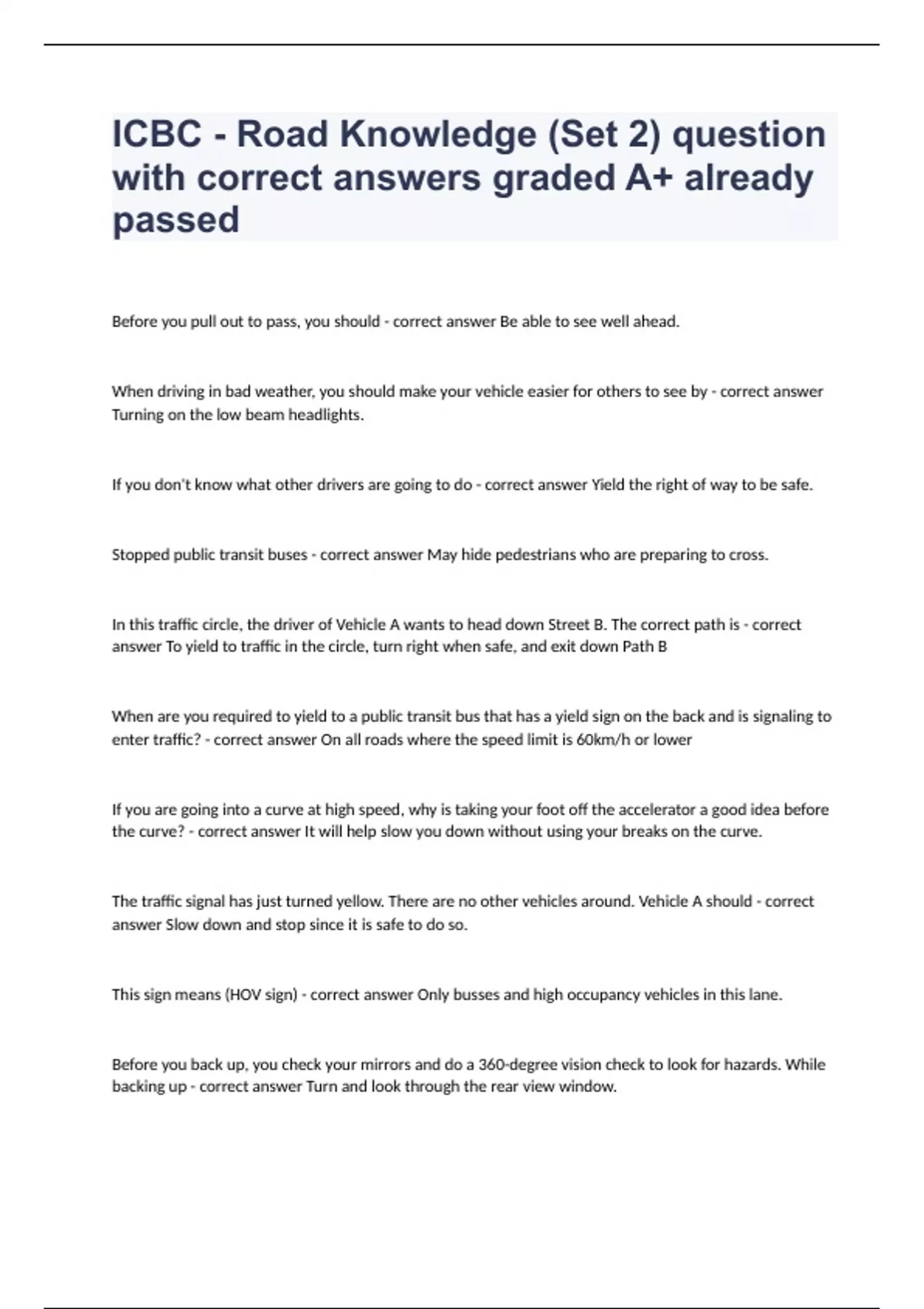 ICBC - Road Knowledge (Set 2) question with correct answers graded A+ already passedBefore you pull out to pass, you should - correct answer Be able to see well ahead. When driving in bad weather, you should make your vehicle easier for others to see by - correct answer Turning on the low beam headlights. If you don't know what other drivers are going to do - correct answer Yield the right of way to be safe. Stopped public transit buses - correct answer May hide pedestrians who are preparing to cross. In this traffic circle, the driver of Vehicle A wants to head down Street B. The correct path is - correct answer To yield to traffic in the circle, turn right when safe, and exit down Path B When are you required to yield to a public transit bus that has a yield sign on the back and is signaling to enter traffic? - correct answer On all roads where the speed limit is 60km/h or lower If you are going into a curve at high speed, why is taking your foot off the accelerator a good idea before the curve? - correct answer It will help slow you down without using your breaks on the curve. The traffic signal has just turned yellow. There are no other vehicles around. Vehicle A should - correct answer Slow down and stop since it is safe to do so. This sign means (HOV sign) - correct answer Only busses and high occupancy vehicles in this lane. Before you back up, you check your mirrors and do a 360-degree vision check to look for hazards. While backing up - correct answer Turn and look through the rear view window.