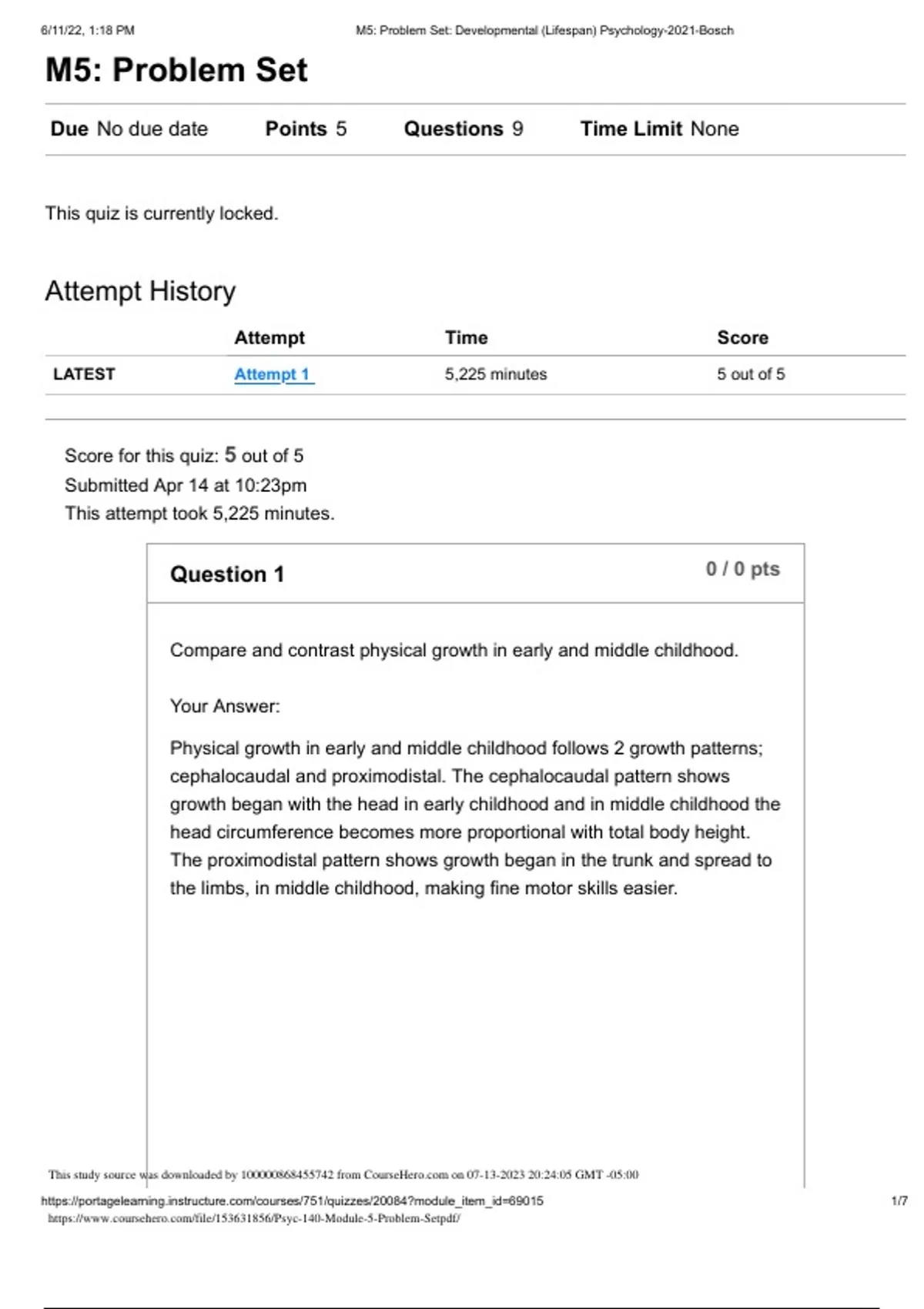 Psyc 140 Module 5 Problem S M5: Problem Set Due No due date Points 5 Questions 9 Time Limit None This quiz is currently locked. Attempt History Attempt Time Score LATEST Attempt 1 5,225 minutes 5 out of 5 Score for this quiz: 5 out of 5 Submitted Apr 14 at 10:23pm This attempt took 5,225 minutes. Q 0 / 0 pts uestion 1 Your Answer: Compare and contrast physical growth in early and middle childhood. Physical growth in early and middle childhood follows 2 growth patterns; cephalocaudal and proximodistal. The cephalocaudal pattern shows growth began with the head in early childhood and in middle childhood the head circumference becomes more proportional with total body height. The proximodistal pattern shows growth began in the trunk and spread to the limbs, in middle childhood, making fine motor skills easier. This study source was downloaded by from CourseH on :24:05 GMT -05:00 6/11/22, 1:18 PM M5: Problem Set: Developmental (Lifespan) Psychology-2021-Bosch In the cephalocaudal pattern of growth, we see development beginning with the head in infancy and early childhood. By middle childhood, major growth can be seen in additional areas; namely, height and weight. The child becomes more proportional in terms of head to full body ratio. In the proximodistal pattern of growth, gross motor skill development occurs in early childhood, while fine motor skills are more readily gained in middle childhood. Ques 0 / 0 pts tion 2 Your Answer: Self-reflection: What are your views of why ADHD diagnoses and rates of childhood obesity have increased? What are the solutions? I think the rates of ADHD diagnoses and childhood obesity have increased because of a variety of factors. For ADHD, nutrition, teratogens, and genetics play major roles in the increasing rates. In the present day there are more man made/synthetic/unnatural things that people consume, whether that by food/drink or drugs. These things could be consumed by the mother and/or father and passed to the child via teratogen which in turn could lead to a later diagnosis of ADHD. The child them-self could also consume something that could contribute to a diagnosis of ADHD. Overtime, this could also turn into a genetic issue. A solution would be to stop consuming said things. I believe the increased rates of obesity can be attributed to socioeconomic status. Right now there are a lot of people who lack education and/or money. Parents may not have the knowledge to pick healthy foods for their children. They also may not be able to afford it. Sadly, fast food is cheaper than healthy food right now so it is hard to come up with a solution to this problem. Answers will vary. This study source was downloaded by from CourseH on :24:05 GMT -05:00 6/11/22, 1:18 PM M5: Problem Set: Developmental (Lifespan) Psychology-2021-Bosch Ques 0 / 0 pts tion 3 Your Answer: What is the recommended treatment for ADHD? Recommended treatment for ADHD is medication (stimulant or nonstimulant) and behavioral therapy. Medication + Behavioral therapy. Ques 0 / 0 pts tion 4 Your Answer: According to Piaget, what cognitive gains are made during the Concrete Operational Stage? The cognitive gains made during the concrete operational stage are conservation, classification, and seriation. Conservation, seriation, and logical thinking. Ques 0 / 0 pts tion 5 Describe the four peer statuses and potential outcomes in adolescence and adulthood pertaining to each. This study source was downloaded by from CourseH on :24:05 GMT -05:00 6/11/22, 1:18 PM M5: Problem Set: Developmental (Lifespan) Psychology-2021-Bosch Your Answer: Popular children are favored by their peers. There are two types; antisocial and prosocial. Antisocial children often use gossip and humiliation to cement their popularity. Prosocial children are very social with out being relational aggressive. In adolescence and adulthood they have quality social skills, are good listeners and communicators. Rejected children are disliked by their peers. In adolescence and adulthood they often lack social skills, use drugs, have aggression, and are shy. Neglected children are ignored by their peers, but not necessarily seen as negative or positive. They have average social skills as adolescents and adults. Controversial children can be viewed as positive or negative by their peers. They have mixed outcomes as adolescents and adults. Popular children tend to be well-liked by their peers and are often socially skilled. These skills often continue into adulthood. Rejected children are actively disliked and some may engage in behaviors that encourage this dislike. Rejected children are at risk for a variety of problems in the future, such as drug use, aggression, and delinquency. Neglected children are largely ignored by their peers, but they may in fact be socially skilled. They seem to have similar outcomes as average children. Controversial children receive both positive and negative votes, and outcomes for these children tend to be mixed (some positive, some negative, depending on the child). Ques 0 / 0 pts tion 6 Your Answer: What are some immediate consequences of divorce? This study source was downloaded by from CourseH on :24:05 GMT -05:00 6/11/22, 1:18 PM M5: Problem Set: Developmental (Lifespan) Psychology-2021-Bosch Immediate consequences in divorce are drop in income, increases in family conflict, and changes in parenting styles. Sharp drop in income (particularly in mother-headed households), increase in family conflict, and changes in parenting styles, among other consequences. Ques 0 / 0 pts tion 7 Your Answer: How does a child’s response to divorce vary according to age and gender? Young children often do not understand why a divorce took place and blame themselves for it. They regress to babyish behaviors. Older children might understand the reason behind a divorce, but act out. They may run away, engage in early sexual activity, and have poor school performance. Girls are more likely to internalize their feelings,