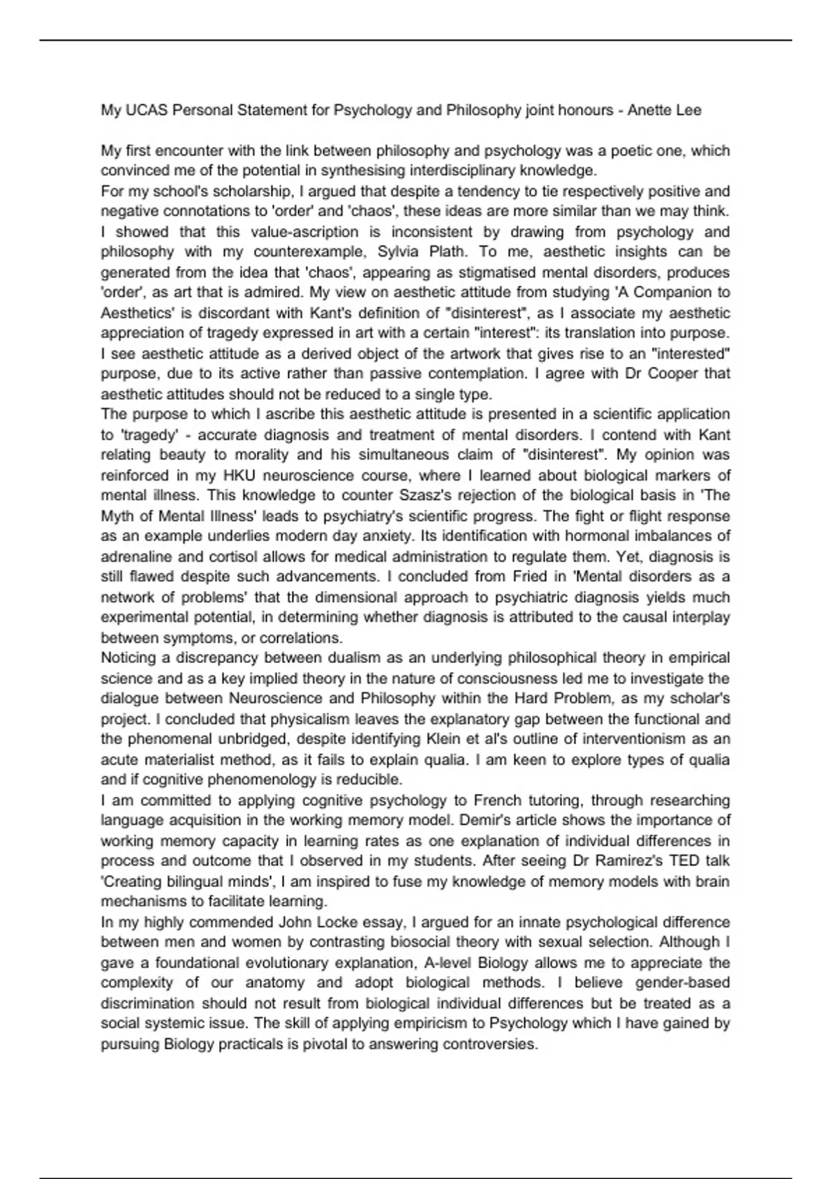 My UCAS Personal Statement for Psychology and Philosophy joint honours - Anette Lee