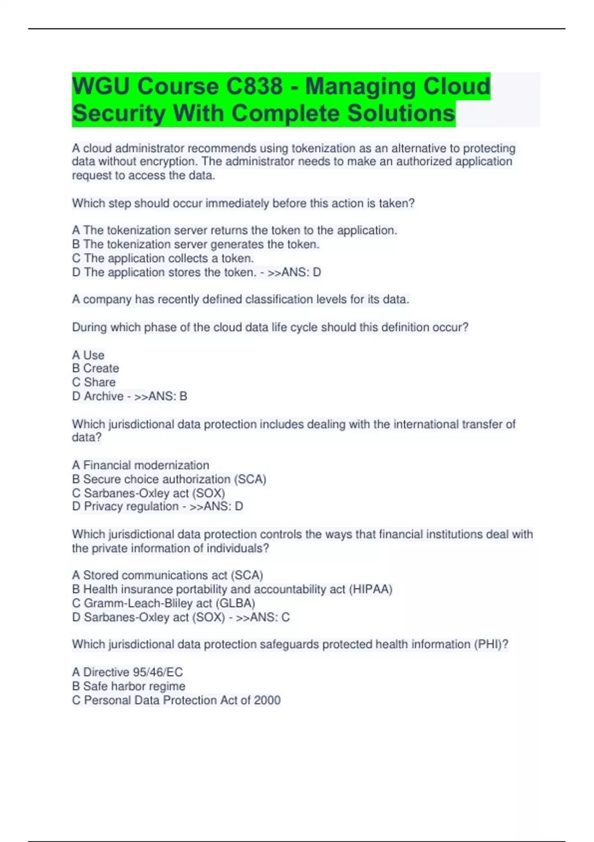 WGU Course C838 - Managing Cloud Security With Complete SolutionsA cloud administrator recommends using tokenization as an alternative to protecting data without encryption. The administrator needs to make an authorized application request to access the data. Which step should occur immediately before this action is taken? A The tokenization server returns the token to the application. B The tokenization server generates the token. C The application collects a token. D The application stores the token. - ANS: D A company has recently defined classification levels for its data. During which phase of the cloud data life cycle should this definition occur? A Use B Create C Share D Archive - ANS: B Which jurisdictional data protection includes dealing with the international transfer of data? A Financial modernization B Secure choice authorization (SCA) C Sarbanes-Oxley act (SOX) D Privacy regulation - ANS: D Which jurisdictional data protection controls the ways that financial institutions deal with the private information of individuals? A Stored communications act (SCA) B Health insurance portability and accountability act (HIPAA) C Gramm-Leach-Bliley act (GLBA) D Sarbanes-Ox