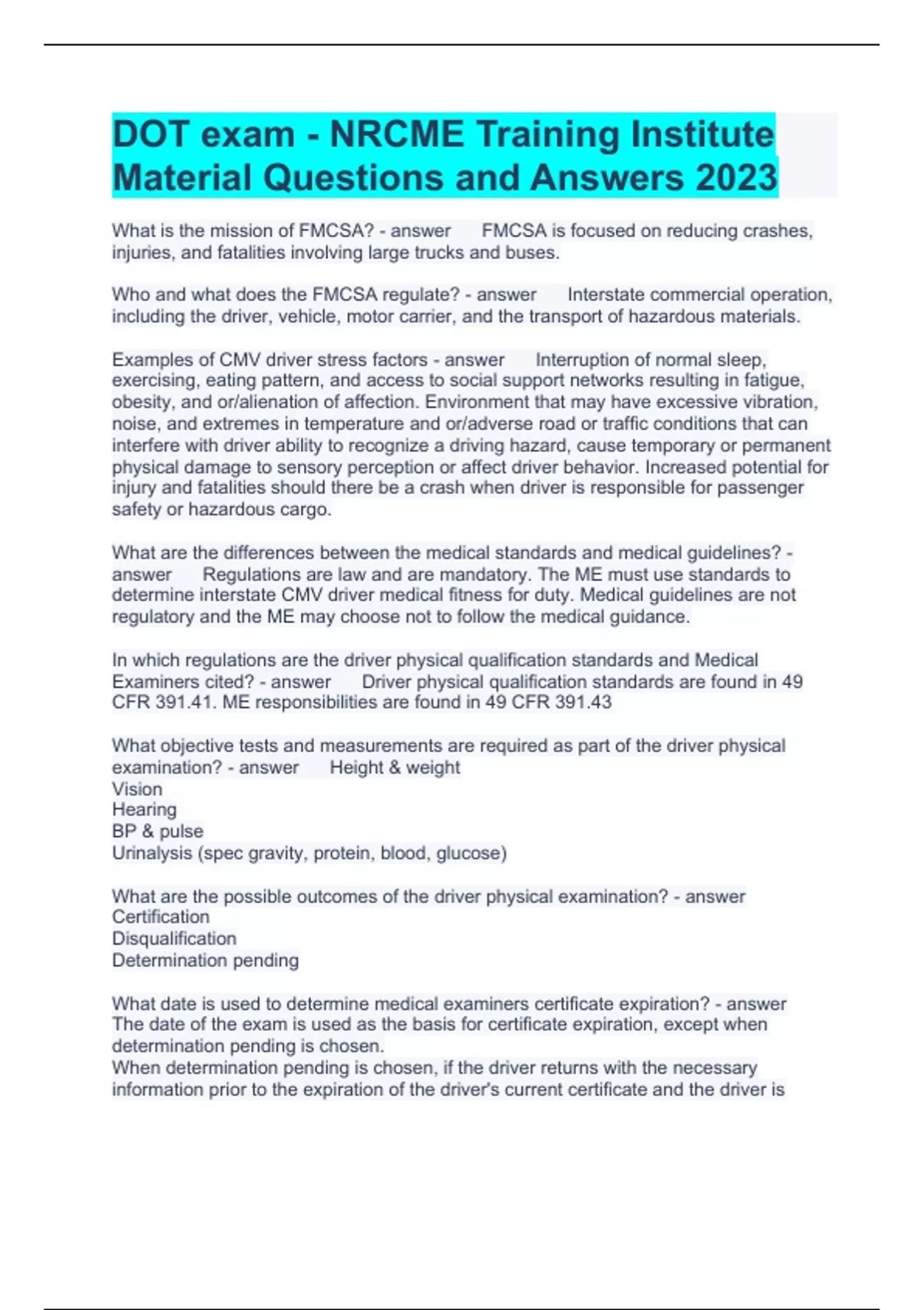 DOT exam - NRCME Training Institute Material Questions and Answers 2023