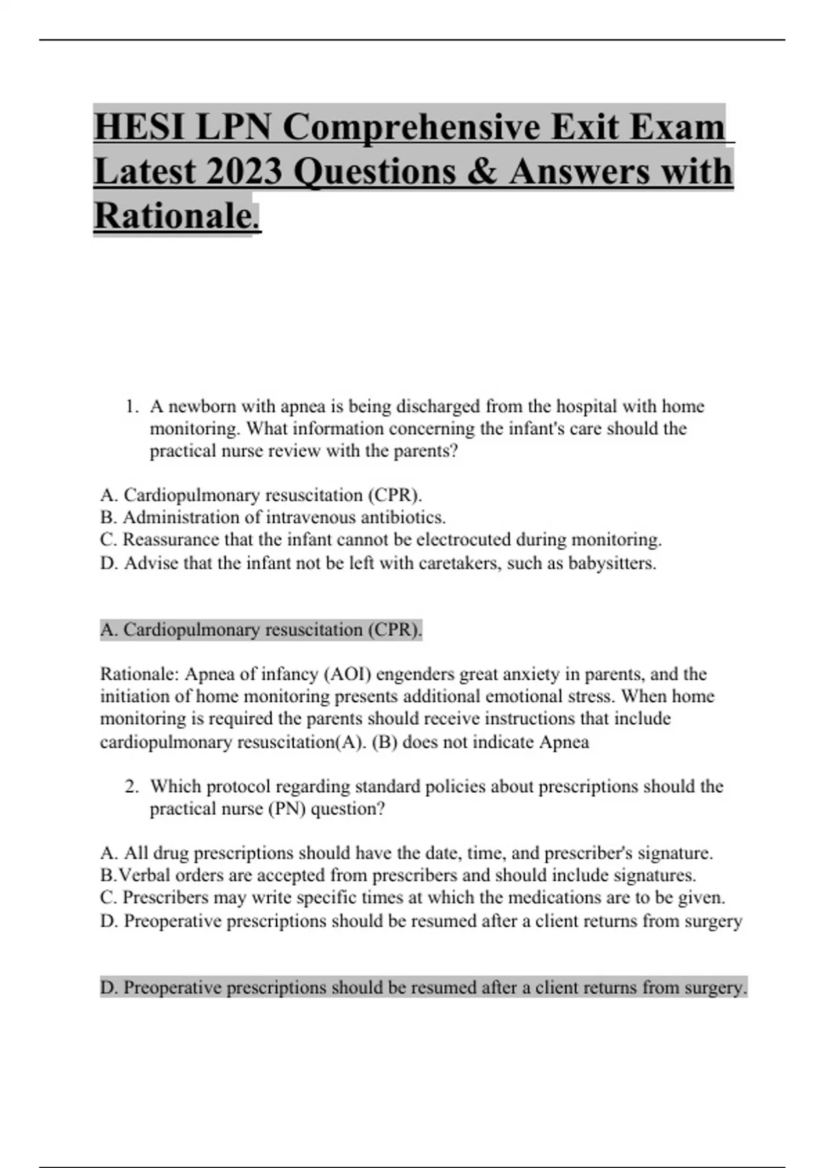 HESI LPN Comprehensive Exit Exam Latest 2023 Questions & Answers with Rationale. 1. A newborn with apnea is being discharged from the hospital with home monitoring. What information concerning the infant's care should the practical nurse review with the parents? A. Cardiopulmonary resuscitation (CPR). B. Administration of intravenous antibiotics. C. Reassurance that the infant cannot be electrocuted during monitoring. D. Advise that the infant not be left with caretakers, such as babysitters. A. Cardiopulmonary resuscitation (CPR). Rationale: Apnea of infancy (AOI) engenders great anxiety in parents, and the initiation of home monitoring presents additional emotional stress. When home monitoring is required the parents should receive instructions that include cardiopulmonary resuscitation(A). (B) does not indicate Apnea 2. Which protocol regarding standard policies about prescriptions should the practical nurse (PN) question? A. All drug prescriptions should have the date, time, and prescriber's signature. B. Verbal orders are accepted from prescribers and should include signatures. C. Prescribers may write specific times at which the medications are to be given. D. Preoperative prescriptions should be resumed after a client returns from surgery D. Preoperative prescriptions should be resumed after a client returns from surgery. Rationale: A standard policy about preoperative medications that preoperative prescriptions are automatically canceled for surgery and should be rewritten, if indicated , in the postoperatively so the (PN) should question (D). (A,B,C) are correct statements.