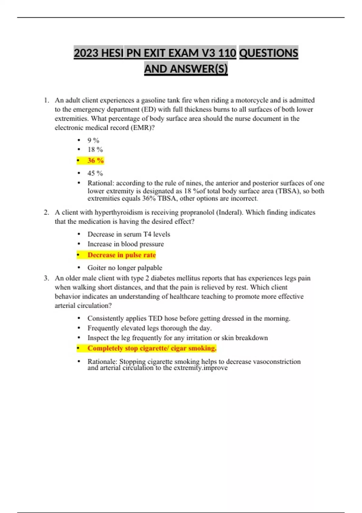 2023 HESI PN EXIT EXAM V3 110 QUESTIONS AND ANSWER(S) 1. An adult client experiences a gasoline tank fire when riding a motorcycle and is admitted to the emergency department (ED) with full thickness burns to all surfaces of both lower extremities. What percentage of body surface area should the nurse document in the electronic medical record (EMR)? • 9 % • 18 % • 36 % • 45 % • Rational: according to the rule of nines, the anterior and posterior surfaces of one lower extremity is designated as 18 %of total body surface area (TBSA), so both extremities equals 36% TBSA, other options are incorrect. 2. A client with hyperthyroidism is receiving propranolol (Inderal). Which finding indicates that the medication is having the desired effect? • Decrease in serum T4 levels • Increase in blood pressure • Decrease in pulse rate • Goiter no longer palpable 3. An older male client with type 2 diabetes mellitus reports that has experiences legs pain when walking short distances, and that the pain is relieved by rest. Which client behavior indicates an understanding of healthcare teaching to promote more effective arterial circulation? • Consistently applies TED hose before getting dressed in the morning. • Frequently elevated legs thorough the day. • Inspect the leg frequently for any irritation or skin breakdown • Completely stop cigarette/ cigar smoking. • Rationale: Stopping cigarette smoking helps to decrease vasoconstriction and arterial circulation to the ve