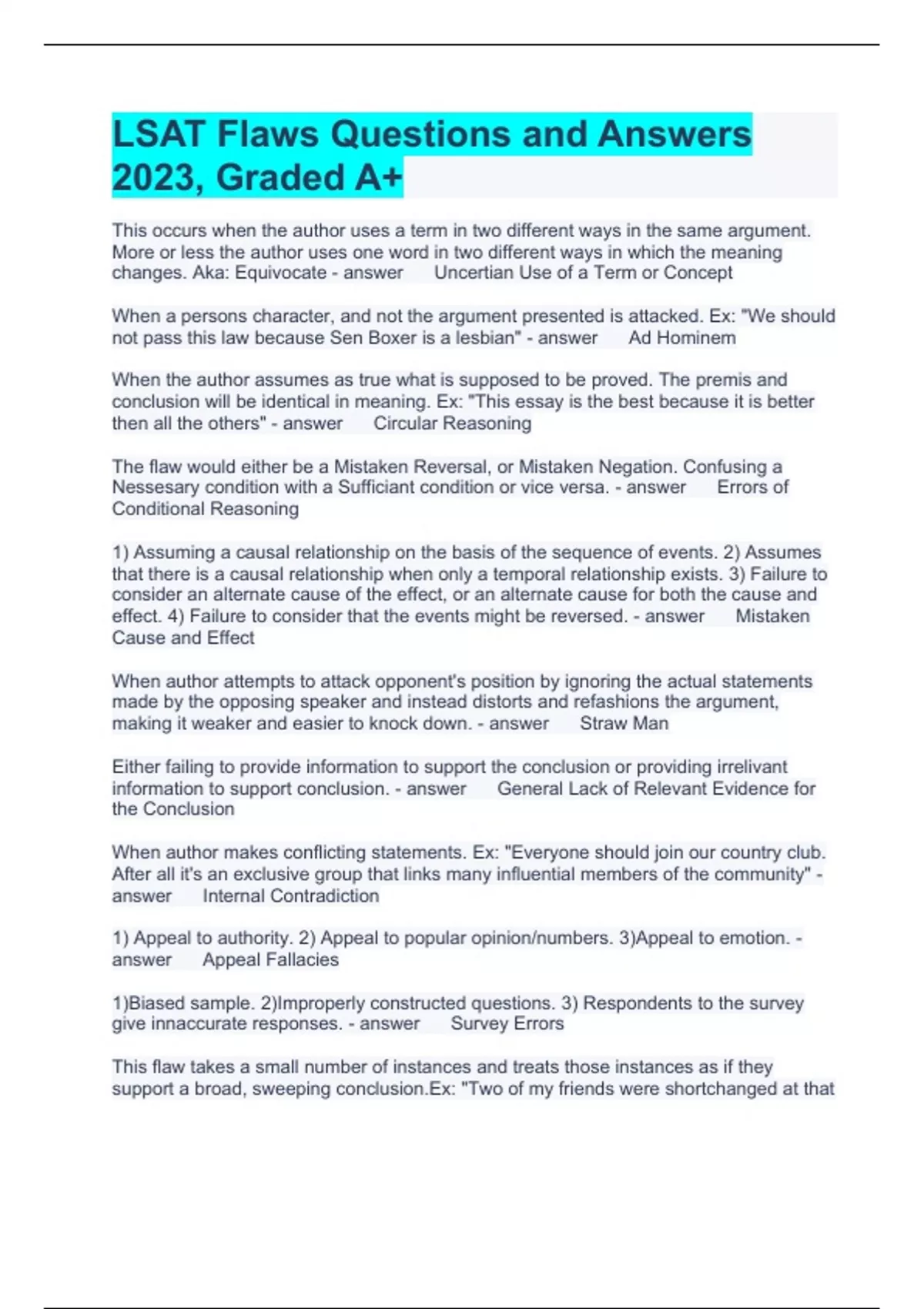 LSAT Flaws Questions and Answers 2023, Graded A+This occurs when the author uses a term in two different ways in the same argument. More or less the author uses one word in two different ways in which the meaning changes. Aka: Equivocate Uncertian Use of a Term or Concept When a persons character, and not the argument presented is attacked. Ex: "We should not pass this law because Sen Boxer is a lesbian" Ad Hominem When the author assumes as true what is supposed to be proved. The premis and conclusion will be identical in meaning. Ex: "This essay is the best because it is better then all the others" Circular Reasoning The flaw would either be a Mistaken Reversal, or Mistaken Negation. Confusing a Nessesary condition with a Sufficiant condition or vice versa. Errors of Conditional Reasoning 1) Assuming a causal relationship on the basis of the sequence of events. 2) Assumes that there is a causal relationship when only a temporal relationship exists. 3) Failure to consider an alternate cause of the effect, or an alternate cause for both the cause and effect. 4) Failure to consider that the events might be reversed. Mistaken Cause and Effect When author attempts to attack opponent's position by ignoring the actual statements made by the opposing speaker and instead distorts and refashions the argument, making it weaker and easier to knock down. Straw Man Either failing to provide information to support the conclusion or providing irrelivant information to support conclusion. General Lack of Relevant Evidence for the Conclusion When author makes conflicting statements. Ex: "Everyone should join our country club. After all it's an exclusive group that links many influential members of the community" Internal Contradiction 1) Appeal to authority. 2) Appeal to popular opinion/numbers. 3)Appeal to emotion. Appeal Fallacies 1)Biased sample. 2)Improperly constructed questions. 3) Respondents to the survey give innaccurate responses. Survey Errors This flaw takes a small number of instances and treats those instances as if they support a broad, sweeping conclusion.Ex: "Two of my friends were shortchanged at that store. Therefore, everyone gets short changed at that store." Exceptional Case/Overgeneralization Errors involve judgments made about groups and parts of a group. Errors of Composition and Division When author attributes a characteristic of part of the group to the group as a whole or to each member of the group. Composition When author attributes a characteristic of the whole (or each member of the whole) to part of the group. Division Occurs when the author uses an analogy that is too dissimilar to the original situation to be applicable. False Analogy Assumes that there are only two courses of action available when in reality there may be others. False Dilemma 1) Lack of Evidence is taken to mean that the position taken is false. 2) Lack of Evidence against the position is taken to mean the position is true. 3) Some evidence against the position is taken to proove the position is false. 4) Some evidence that supports the position is taken to mean that the position is true. Errors in the use of Evidence This flaw assumes that conditions will remain constant over time, and that what is the case in the past will be the case in the future. Time Shift Errors