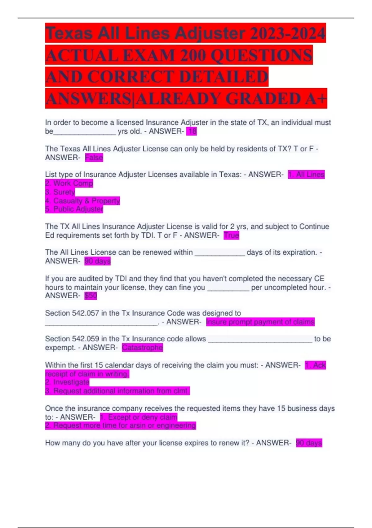 0 QUESTIONS AND CORRECT DETAILED ANSWERS|ALREADY GRADED A+ In order to become a licensed Insurance Adjuster in the state of TX, an individual must be_______________ yrs old. - ANSWER- 18 The Texas All Lines Adjuster License can only be held by residents of TX? T or F - ANSWER- False List type of Insurance Adjuster Licenses available in Texas: - ANSWER- 1. All Lines 2. Work Comp 3. Surety 4. Casualty & Property 5. Public Adjuster The TX All Lines Insurance Adjuster License is valid for 2 yrs, and subject to Continue Ed requirements set forth by TDI. T or F - ANSWER- True The All Lines License can be renewed within ____________ days of its expiration. - ANSWER- 90 days If you are audited by TDI and they find that you haven't completed the necessary CE hours to maintain your license, they can fine you __________ per uncompleted hour. - ANSWER- $50 Section 542.057 in the Tx Insurance Code was designed to ___________________________. - ANSWER- Insure prompt payment of claims Section 542.059 in the Tx Insurance code allows _________________________ to be expempt. - ANSWER- Catastrophe Within the first 15 calendar days of receiving the claim you must: - ANSWER- 1. Ack receipt of claim in writing. 2. Investigate 3. Request additional information from clmt. Once the insurance company receives the requested items they have 15 business days to: - ANSWER- 1. Except or deny claim 2. Request more time for arsin or engineering How many do you have after your license expires to renew it? - ANSWER- 90 days Texas All Lines Adjuster ACTUAL EXAM 200 QUESTIONS AND CORRECT DETAILED ANSWERS|ALREADY GRADED A+ When does your license expire? - ANSWER- 2 years on your birthday How many business days do you have for arsin? - ANSWER- 30 business days How many business days do you have for engineering? - ANSWER- 45 business days Penalties for insurer's who delay paying claims beyond ___________ days unless delay is authorized by TX law. - ANSWER- 60 days How many days does the insurer have to send a check once they agree to pay the claim? - ANSWER- 5 business days The deceptive trade practices act prevents insurers from refusing a policy renewal based on? - ANSWER- 1. Age 2. Sex 3. Religion A carrier can refuse renewal of a policy due to _________ non weather related claims in ______________ years or less. - ANSWER- 3 & 3 Home Owners - A provides coverage A (structure) and Coverage B (personal property contents) on a ________________________. - ANSWER- Names Peril Home owners - B provides coverage A (structure) for ___________________, unless specifically excluded and coverage B (personal property contents) on a names peril basis. - ANSWER- All risk Coverage A (dwelling) has a _____________ % of coverage A limit of liability for other structure. - ANSWER- 10% Coverage B (Personal Property Contents) provides: - ANSWER- 1. Coverage of property anywhere in the world 2. Special limits on certain property, ie theft Special Limist of Liability: 1. Cash is limited to _____________. Texas All Lines Adjuster ACTUAL EXAM 200 QUESTIONS AND CORRECT DETAILED ANSWERS|ALREADY GRADED A+ 2. Jewelry theft loss limited to __________________. - ANSWER- 1. $500; if you have over $500 that is stolen, you still only get $500. 2. $1000 max for 1 article stolen / $2500 max for more than 1 article stolen. Coverage C protects against _______________________. - ANSWER- Personal Liability Coverage D protects against __________________________. - ANSWER- Medical payment to others Animals or birds owned or kept by an insured or occupants of the premises are covered under _______________________________________. - ANSWER- Exclusions (birds and animals are not covered) Fire, Hurricane, Wind storm, theft are examples of what? - ANSWER- Peril What part of the policy do you find a persons name and locations? - ANSWER- Dec page Ending a policy before a renewal date is known as ______________________. - ANSWER- Cancellation Special limit only applies to ______________________? - ANSWER- Theft Guarantee and makes sure an obligation is met is what? - ANSWER- Surety Bond What do endorsements do on a policy? - ANSWER- Add coverage to the policy What is indemnity? - ANSWER- To hold harmless. Transferring your risk to an insurance policy. What are losses: 1. Direct loss 2. Indirect loss 3. Consequential loss 4. Liability loss - ANSWER- 1. Direct Loss: actual physical loss 2. Indirect loss: cannot use property due to loss. 3. Loss due to spoilage such as food.