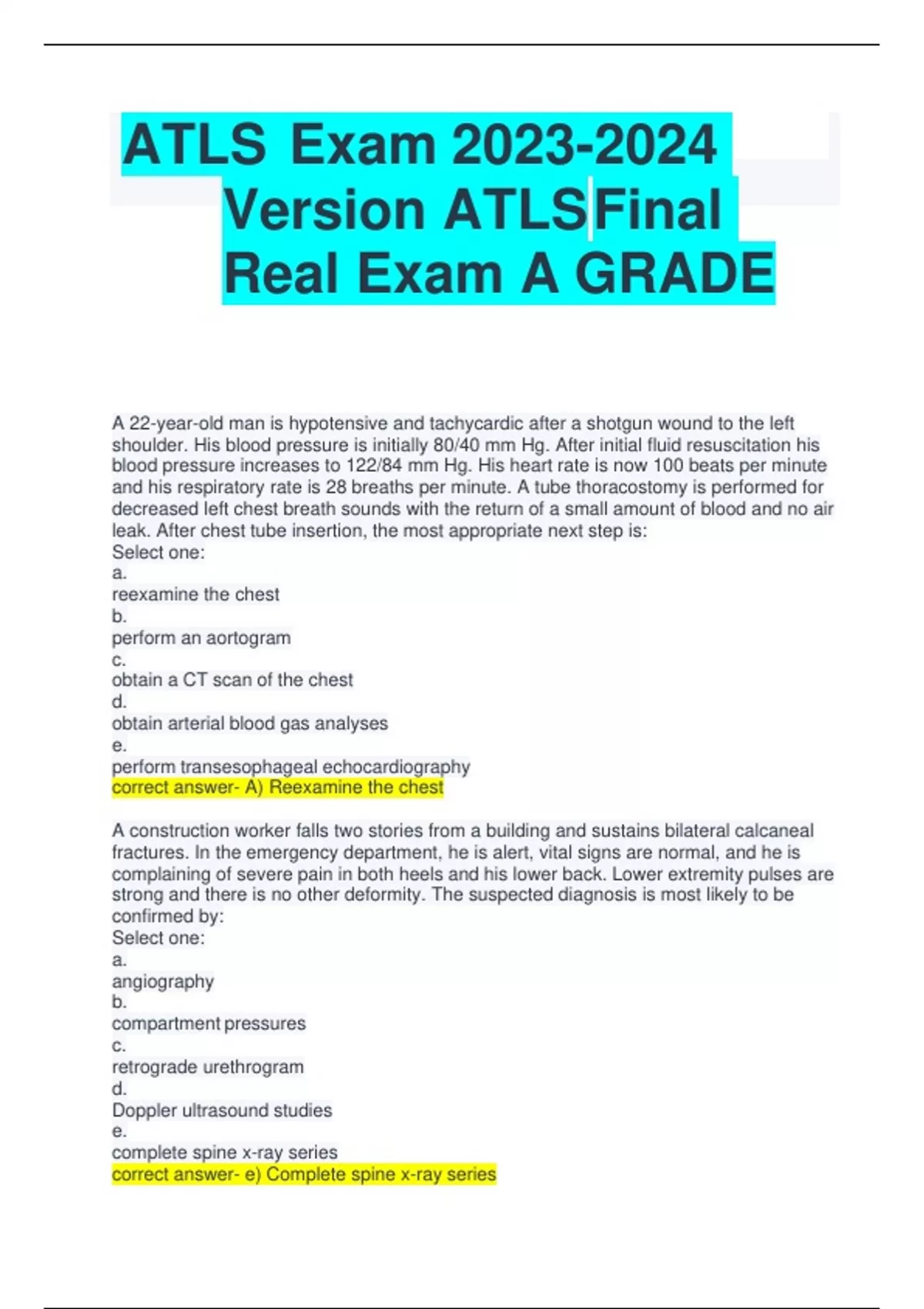 ATLS Exam Version ATLS Final Real Exam A GRADE A 22-year-old man is hypotensive and tachycardic after a shotgun wound to the left shoulder. His blood pressure is initially 80/40 mm Hg. After initial fluid resuscitation his blood pressure increases to 122/84 mm Hg. His heart rate is now 100 beats per minute and his respiratory rate is 28 breaths per minute. A tube thoracostomy is performed for decreased left chest breath sounds with the return of a small amount of blood and no air leak. After chest tube insertion, the most appropriate next step is: Select one: a. reexamine the chest b. perform an aortogram c. obtain a CT scan of the chest d. obtain arterial blood gas analyses e. perform transesophageal echocardiography correct answer- A) Reexamine the chest A construction worker falls two stories from a building and sustains bilateral calcaneal fractures. In the emergency department, he is alert, vital signs are normal, and he is complaining of severe pain in both heels and his lower back. Lower extremity pulses are strong and there is no other deformity. The suspected diagnosis is most likely to be confirmed by: Select one: a. angiography b. compartment pressures c. retrograde urethrogram d. Doppler ultrasound studies e. complete spine x-ray series correct answer- e) Complete spine x-ray series Which of the following is true regarding the initial resuscitation of a trauma patient? Select one: a. A patient that presents with a torso gunshot wound and is hypotensive should receive crystalloid fluid resuscitation until the blood pressure is normal b. Evidence of improved perfusion after fluid resuscitation could include improvement in Glasgow coma scale score on reevaluation c. Massive transfusion is defined as transfusion of more than 10 of packed red blood cells and plasma in 24 hours d. When tranexamic acid is administered by pre-hospital providers a second dose is required within 24 hours e. Fluid resuscitation is far more important than bleeding control in trauma patients correct answer- b. Evidence of improved perfusion after fluid resuscitation could include improvement in Glasgow coma scale score on reevaluation