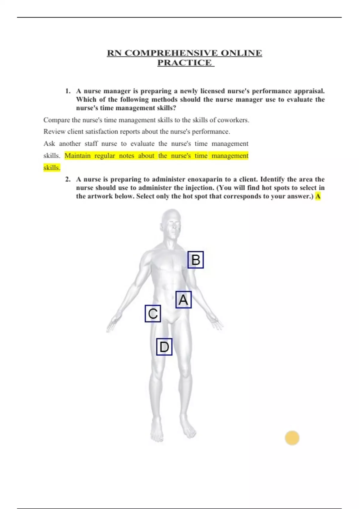 RN COMPREHENSIVE ONLINE PRACTICE 1.A nurse manager is preparing a newly licensed nurse's performance appraisal. Which of the following methods should the nurse manager use to evaluate the nurse's time management skills? Compare the nurse's time management skills to the skills of coworkers. Review client satisfaction reports about the nurse's performance. Ask another staff nurse to evaluate the nurse's time management skills. Maintain regular notes about the nurse's time management skills.