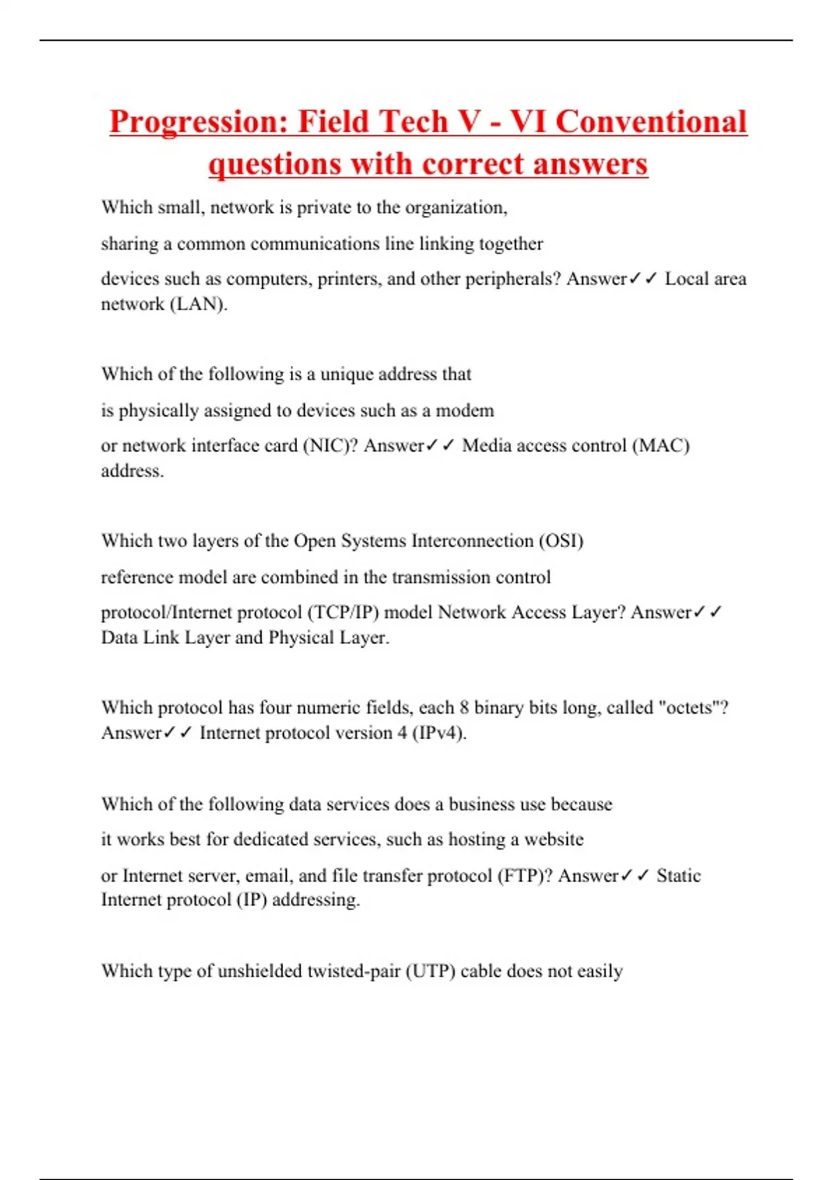 Which small, network is private to the organization, sharing a common communications line linking together devices such as computers, printers, and other peripherals? Answer Local area network (LAN). Which of the following is a unique address that is physically assigned to devices such as a modem or network interface card (NIC)? Answer Media access control (MAC) address. Which two layers of the Open Systems Interconnection (OSI) reference model are combined in the transmission control protocol/Internet protocol (TCP/IP) model Network Access Layer? Answer Data Link Layer and Physical Layer. Which protocol has four numeric fields, each 8 binary bits long, called "octets"? Answer Internet protocol version 4 (IPv4). Which of the following data services does a business use because it works best for dedicated services, such as hosting a website or Internet server, email, and file transfer protocol (FTP)? Answer Static Internet protocol (IP) addressing.