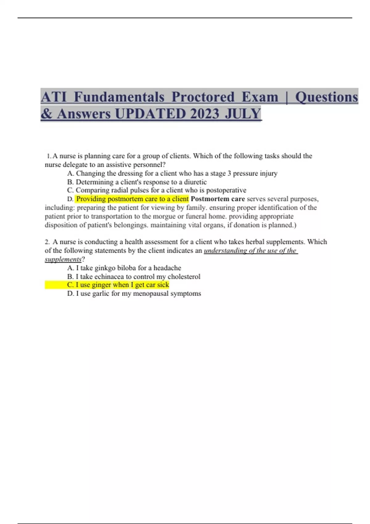 ATI Fundamentals Proctored Exam | Questions & Answers UPDATED 2023 JULY 1. A nurse is planning care for a group of clients. Which of the following tasks should the nurse delegate to an assistive personnel? A. Changing the dressing for a client who has a stage 3 pressure injury B. Determining a client's response to a diuretic C. Comparing radial pulses for a client who is postoperative D. Providing postmortem care to a client Postmortem care serves several purposes, including: preparing the patient for viewing by family. ensuring proper identification of the patient prior to transportation to the morgue or funeral home. providing appropriate disposition of patient's belongings. maintaining vital organs, if donation is planned.) 2. A nurse is conducting a health assessment for a client who takes herbal supplements. Which of the following statements by the client indicates an understanding of the use of the supplements? A. I take ginkgo biloba for a headache B. I take echinacea to control my cholesterol C. I use ginger when I get car sick D. I use garlic for my menopausal symptoms 3. A nurse is caring for a client who has influenza and isolation precautions in place. Which of the following actions should the nurse take to prevent the spread of infection? A. Wear a mask when working within 3 feet of the client B. Administer metronidazole C. Don protective eyewear before entering the room. D. Place the client in a negative airflow room