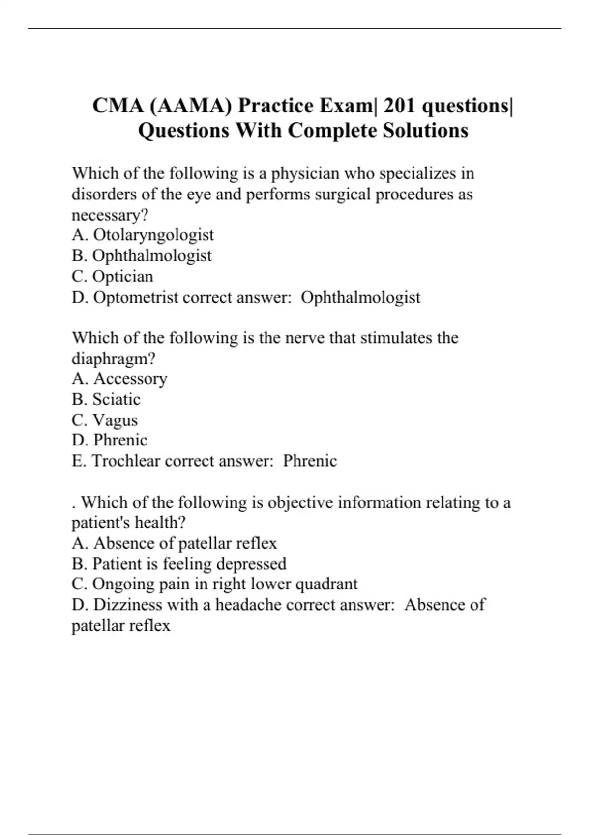 Which of the following is a physician who specializes in disorders of the eye and performs surgical procedures as necessary? A. Otolaryngologist B. Ophthalmologist C. Optician D. Optometrist correct answer: Ophthalmologist Which of the following is the nerve that stimulates the diaphragm? A. Accessory B. Sciatic C. Vagus D. Phrenic E. Trochlear correct answer: Phrenic . Which of the following is objective information relating to a patient's health? A. Absence of patellar reflex B. Patient is feeling depressed C. Ongoing pain in right lower quadrant D. Dizziness with a headache correct answer: Absence of patellar reflex 4. Which of the following is a laboratory test commonly performed on a specimen from a patient taking furosemide (Lasix)? A. Potassium level B. Thyroid-stimulating hormone assay C. Hemoglobin analysis D. White blood count correct answer: