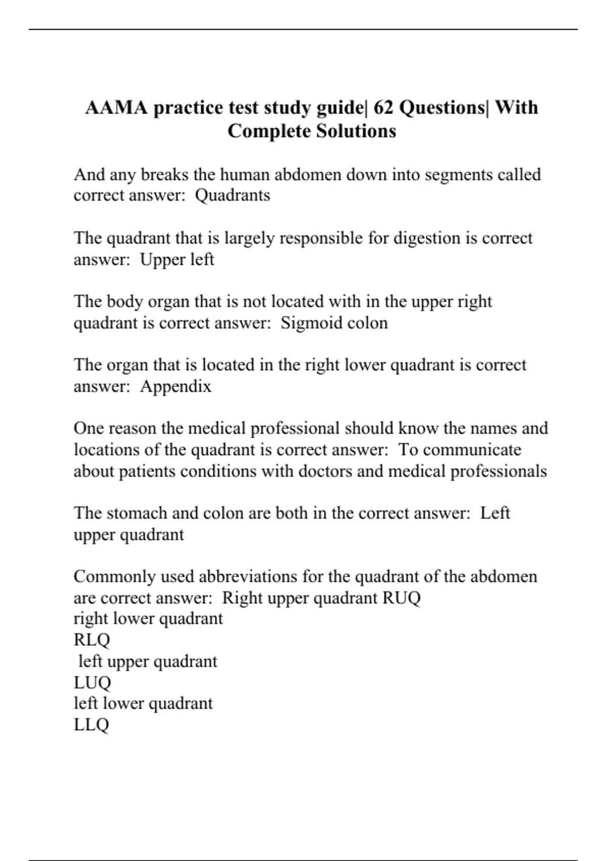 And any breaks the human abdomen down into segments called correct answer: Quadrants The quadrant that is largely responsible for digestion is correct answer: Upper left The body organ that is not located with in the upper right quadrant is correct answer: Sigmoid colon The organ that is located in the right lower quadrant is correct answer: Appendix One reason the medical professional should know the names and locations of the quadrant is correct answer: To communicate about patients conditions with doctors and medical professionals The stomach and colon are both in the correct answer: Left upper quadrant Commonly used abbreviations for the quadrant of the abdomen are correct answer: Right upper quadrant RUQ right lower quadrant RLQ left upper quadrant LUQ left lower quadrant LLQ