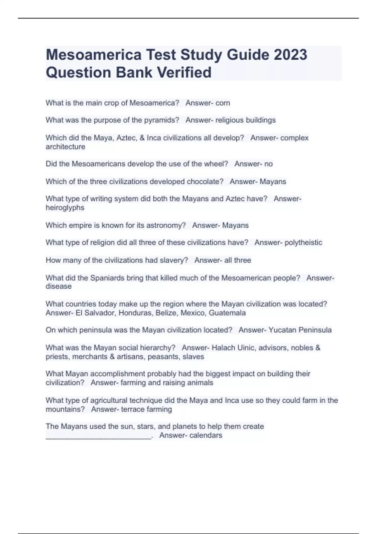 Mesoamerica Test Study Guide 2023 Question Bank Verified
