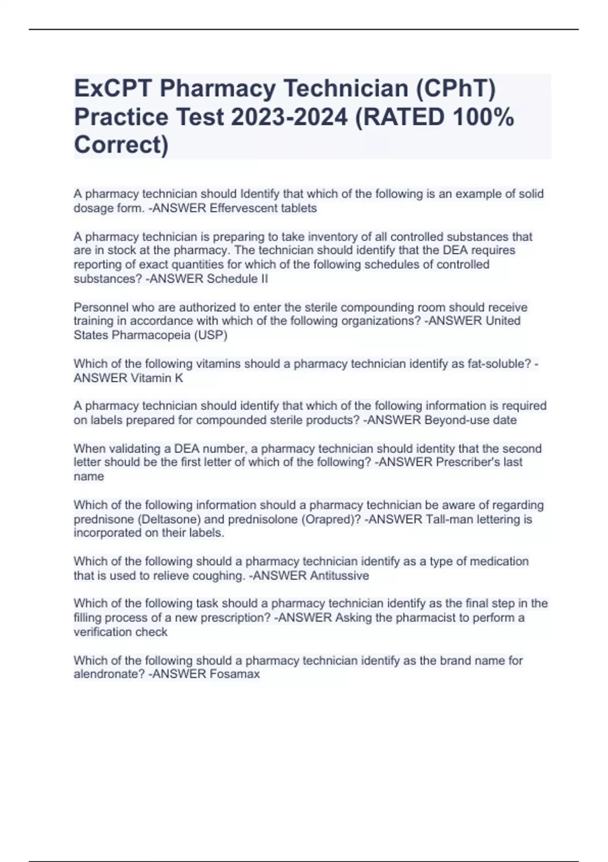 ExCPT Pharmacy Technician (CPhT) Practice Test (RATED 100% Correct)ExCPT Pharmacy Technician (CPhT) Practice Test (RATED 100% Correct)ExCPT Pharmacy Technician (CPhT) Practice Test (RATED 100% Correct)ExCPT Pharmacy Technician (CPhT) Practice Test (RATED 100% Correct) A pharmacy technician should Identify that which of the following is an example of solid dosage form. -ANSWER Effervescent tablets A pharmacy technician is preparing to take inventory of all controlled substances that are in stock at the pharmacy. The technician should identify that the DEA requires reporting of exact quantities for which of the following schedules of controlled substances? -ANSWER Schedule II Personnel who are authorized to enter the sterile compounding room should receive training in accordance with which of the following organizations? -ANSWER United States Pharmacopeia (USP) Which of the following vitamins should a pharmacy technician identify as fat-soluble? -ANSWER Vitamin K A pharmacy technician should identify that which of the following information is required