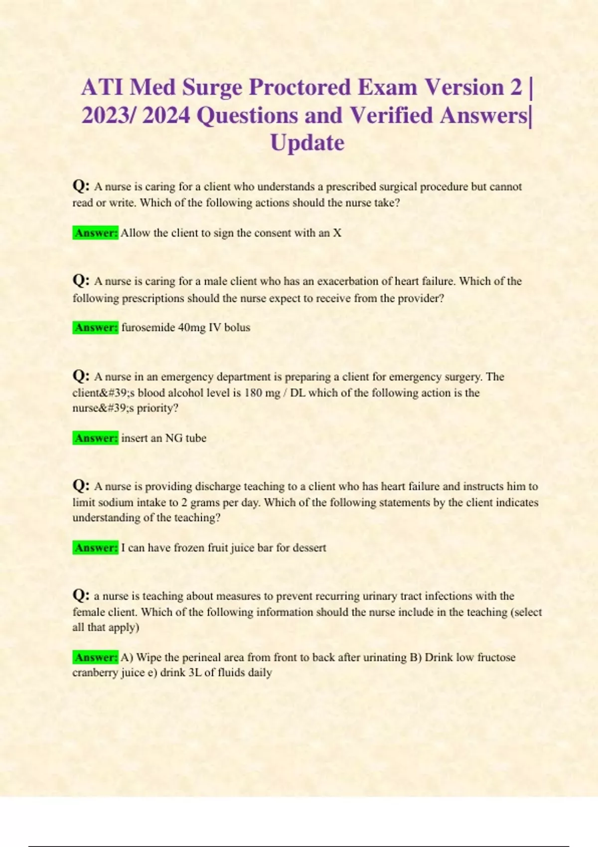 ATI Med Surge Proctored Exam Version 2 | 2023/ 2024 Questions and Verified Answers| Update Q: A nurse is caring for a client who understands a prescribed surgical procedure but cannot read or write. Which of the following actions should the nurse take? Answer: Allow the client to sign the consent with an X Q: A nurse is caring for a male client who has an exacerbation of heart failure. Which of the following prescriptions should the nurse expect to receive from the provider? Answer: furosemide 40mg IV bolus Q: A nurse in an emergency department is preparing a client for emergency surgery. The client's blood alcohol level is 180 mg / DL which of the following action is the nurse's priority? Answer: insert an NG tube Q: A nurse is providing discharge teaching to a client who has heart failure and instructs him to limit sodium intake to 2 grams per day. Which of the following statements by the client indicates understanding of the teaching? Answer: I can have frozen fruit juice bar for dessert Q: a nurse is teaching about measures to prevent recurring urinary tract infections with the female client. Which of the following information should the nurse include in the teaching (select all that apply) Answer: A) Wipe the perineal area from front to back after urinating B) Drink low fructose cranberry juice e) drink 3L of fluids daily Q: A nurse is caring for a client who has tuberculosis and is taking rifampin. The client reports that her saliva has turned red orange in color. Which of the following responses should the nurse make?- Answer: This is an expected adverse effect on thsi medication Q: A nurse is providing discharge teaching for a client who has osteomyelitis in the left leg. Which of the following findings should the nurse identify as requiring a referral? Answer: The client has a prescription for long term IV Antibiotic Therapy Q: A nurse is preparing to discontinue long-term TPN therapy for a client. The nurse should plan to discontinue TPN gradually to reduce the risk of which of the following adverse effects? Answer: Hypo- glycemia Q: A nurse is caring for a group of clients. The nurse should obtain a blood pressure reading using only the left extremity for which of the following clients? Answer: A client who has a right upper extremity arteriovenous fistula Q: A nurse is reviewing the ECG rhythm strips for a group of clients. The nurse should identify that which of the following rhythms indicates bradycardia? Answer: Bradycardia Q: A nurse is caring for a client who has developed a heart rate of 38/min and reports tremors and feeling faint. Which of the following medications should the nurse anticipate administering? Answer: Atropine sulfate Q: A nurse on a medical unit is planning care for a group of clients. Which of the following clients should the nurse attend to First? Answer: A client who has thrombocytopenia and reports a nosebleed