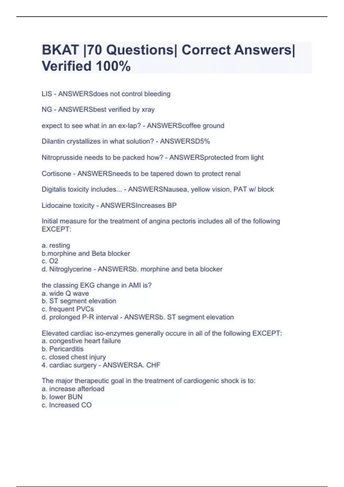 LIS - ANSWERSdoes not control bleeding NG - ANSWERSbest verified by xray expect to see what in an ex-lap? - ANSWERScoffee ground Dilantin crystallizes in what solution? - ANSWERSD5% Nitroprusside needs to be packed how? - ANSWERSprotected from light Cortisone - ANSWERSneeds to be tapered down to protect renal Digitalis toxicity includes... - ANSWERSNausea, yellow vision, PAT w/ block Lidocaine toxicity - ANSWERSIncreases BP Initial measure for the treatment of angina pectoris includes all of the following EXCEPT: a. resting ine and Beta blocker c. O2 d. Nitroglycerine - ANSWERSb. morphine and beta blocker the classing EKG change in AMI is? a. wide Q wave b. ST segment elevation c. frequent PVCs d. prolonged P-R interval - ANSWERSb. ST segment elevation Elevated cardiac iso-enzymes generally occure in all of the following EXCEPT: a. congestive heart failure b. Pericarditis c. closed chest injury 4. cardiac surgery - ANSWERSA. CHF The major therapeutic goal in the treatment of cardiogenic shock is to: a. increase afterload b. lower BUN c. Increased CO