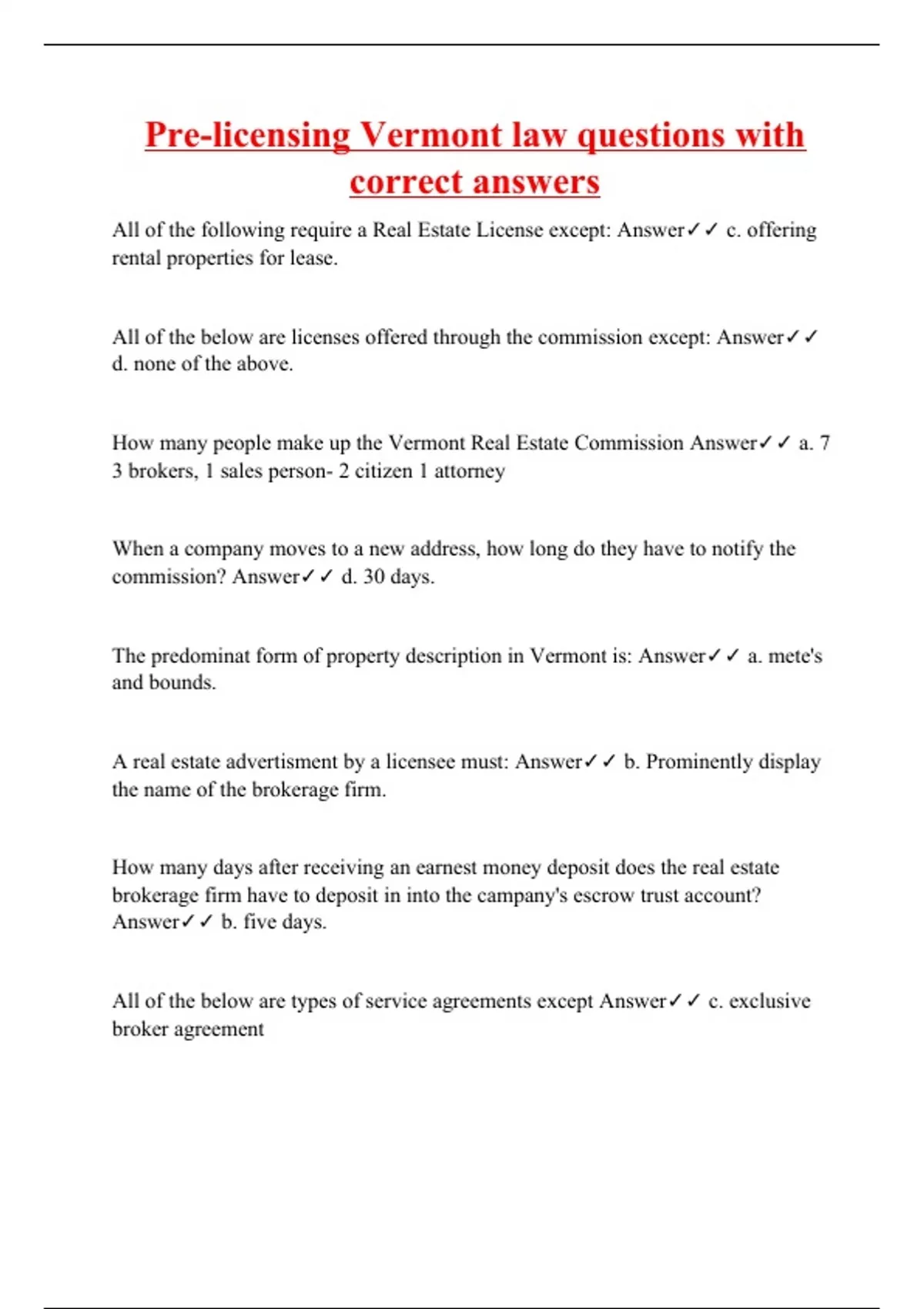 All of the following require a Real Estate License except: Answer c. offering rental properties for lease. All of the below are licenses offered through the commission except: Answer d. none of the above. How many people make up the Vermont Real Estate Commission Answer a. 7 3 brokers, 1 sales person- 2 citizen 1 attorney When a company moves to a new address, how long do they have to notify the commission? Answer d. 30 days. The predominat form of property description in Vermont is: Answer a. mete's and bounds. A real estate advertisment by a licensee must: Answer b. Prominently display the name of the brokerage firm. How many days after receiving an earnest money deposit does the real estate brokerage firm have to deposit in into the campany's escrow trust account? Answer b. five days.