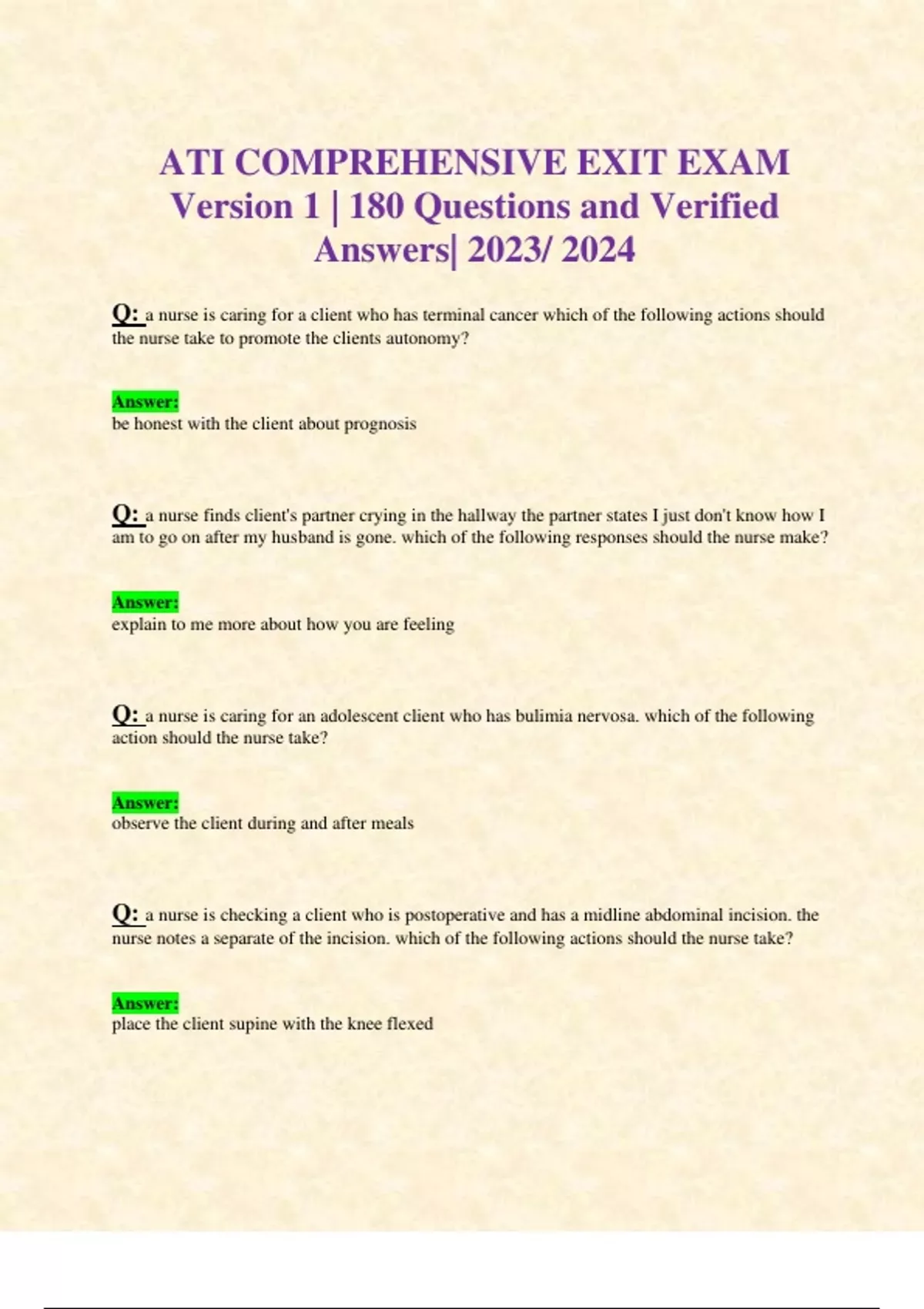 ATI COMPREHENSIVE EXIT EXAM Version 1 | 180 Questions and Verified Answers| 2023/ 2024 Q: a nurse is caring for a client who has terminal cancer which of the following actions should the nurse take to promote the clients autonomy? Answer: be honest with the client about prognosis Q: a nurse finds client's partner crying in the hallway the partner states I just don't know how I am to go on after my husband is gone. which of the following responses should the nurse make? Answer: explain to me more about how you are feeling Q: a nurse is caring for an adolescent client who has bulimia nervosa. which of the following action should the nurse take? Answer: observe the client during and after meals Q: a nurse is checking a client who is postoperative and has a midline abdominal incision. the nurse notes a separate of the incision. which of the following actions should the nurse take? Answer: place the client supine with the knee flexed Q: a nurse is caring for a school age child who has ADHD and is taking methylphenidate. the nurse should identify which of the following is the adverse effect of this medication? Answer: Tinnitus Q: a nurse is administering medication to a client. which of the following actions should the nurse take? Answer: verify with another nurse when calculating a new dose of medication Q: a nurse is preparing to administer protamine to a client. which of the following therapeutic effects should the nurse expect to document in the clients medical record? Answer: decreased clotting time Q: a nurse is caring for a client in a mental health facility who is pacing back and fourth and wringing his hands. which of the following actions should the nurse take? Answer: walk with the client to the recreation room Q: a nurse is caring for a client who is 2 days postoperative following an above the knew amputation. which of the following actions should the nurse take to promote progression toward independence and mobility for the client? Answer: encourage the client to use the over the bed trapeze Q: a nurse is at a pediatric clinic and is checking the vital signs of a 2 month old infant prior to administrating immunizations. the nurse should recognize that a respiratory rate of 30/min indicates which of the following findings? Answer: the reference rate is within the expected reference range Q: a nurse in a clinic is collecting data from a client who had a vaginal birth 6 weeks ago. which of the following findings should the nurse expect? Answer: report of lochia Q: a nurse is reinforcing discharged teaching with the family of a client who has dependent personality disorder. which of the following instructions should the nurse include in the teachings? Answer: assume responsibility for making the clients decisions Q: a charge nurse in a long term care facility notices the smell of alcohol on a nurses breath which of the following actions should the nurse take first? Answer: remove the nurse from the client care area Q: a nurse is supervising an assistive personnel (AP) which of the following actions by the AP indicates effective use of the client care materials? Answer: wear clean gloves when assisting a client with oral hygiene
