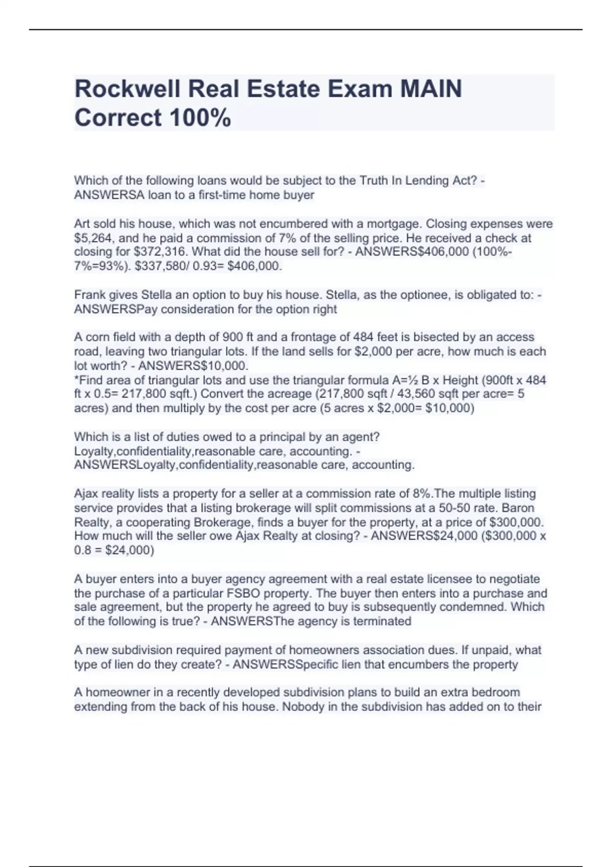 Which of the following loans would be subject to the Truth In Lending Act? - ANSWERSA loan to a first-time home buyer Art sold his house, which was not encumbered with a mortgage. Closing expenses were $5,264, and he paid a commission of 7% of the selling price. He received a check at closing for $372,316. What did the house sell for? - ANSWERS$406,000 (100%-7%=93%). $337,580/ 0.93= $406,000. Frank gives Stella an option to buy his house. Stella, as the optionee, is obligated to: - ANSWERSPay consideration for the option right A corn field with a depth of 900 ft and a frontage of 484 feet is bisected by an access road, leaving two triangular lots. If the land sells for $2,000 per acre, how much is each lot worth? - ANSWERS$10,000. *Find area of triangular lots and use the triangular formula A=½ B x Height (900ft x 484 ft x 0.5= 217,800 sqft.) Convert the acreage (217,800 sqft / 43,560 sqft per acre= 5 acres) and then multiply by the cost per acre (5 acres x $2,000= $10,000) Which is a list of duties owed to a principal by an agent?Loyalty,confidentiality,reasonable care, accounting. - ANSWERSLoyalty,confidentiality,reasonable care, accounting. Ajax reality lists a property for a seller at a commission rate of 8%.The multiple listing service provides that a listing brokerage will split commissions at a 50-50 rate. Baron Realty, a cooperating Brokerage, finds a buyer for the property, at a price of $300,000. How much will the seller owe Ajax Realty at closing? - ANSWERS$24,000 ($300,000 x 0.8 = $24,000) A buyer enters into a buyer agency agreement with a real estate licensee to negotiate the purchase of a particular FSBO property. The buyer then enters into a purchase and sale agreement, but the property he agreed to buy is subsequently condemned. Which of the following is true? - ANSWERSThe agency is terminated A new subdivision required payment of homeowners association dues. If unpaid, what type of lien do they create? - ANSWERSSpecific lien that encumbers the property A homeowner in a recently developed subdivision plans to build an extra bedroom extending from the back of his house. Nobody in the subdivision has added on to their houses in a similar manner yet. What would the homeowner