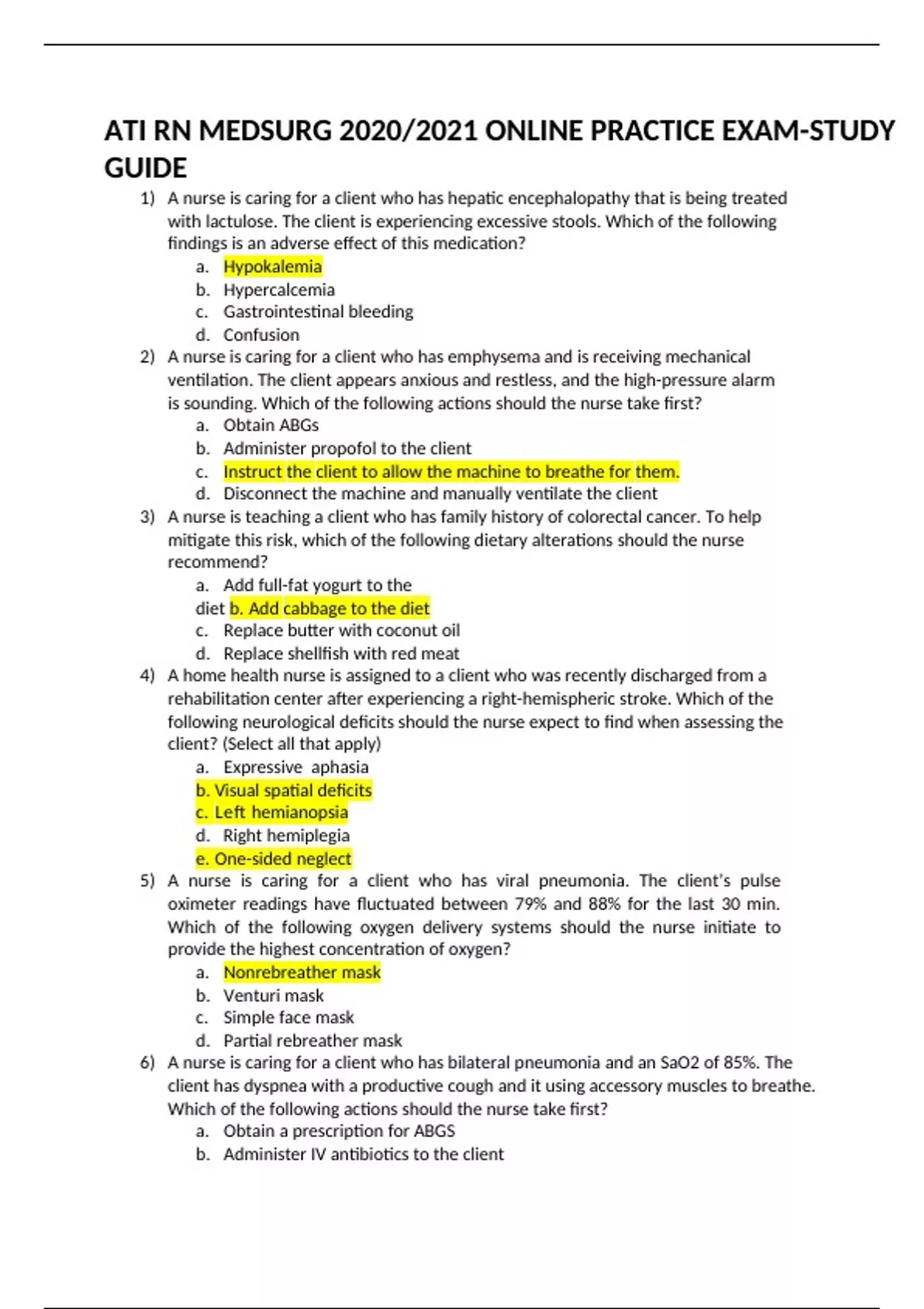 1) A nurse is caring for a client who has hepatic encephalopathy that is being treated with lactulose. The client is experiencing excessive stools. Which of the following findings is an adverse effect of this medication? a. Hypokalemia b. Hypercalcemia c. Gastrointestinal bleeding d. Confusion 2) A nurse is caring for a client who has emphysema and is receiving mechanical ventilation. The client appears anxious and restless, and the high-pressure alarm is sounding. Which of the following actions should the nurse take first? a. Obtain ABGs b. Administer propofol to the client c. Instruct the client to allow the machine to breathe for them. d. Disconnect the machine and manually ventilate the client 3) A nurse is teaching a client who has family history of colorectal cancer. To help mitigate this risk, which of the following dietary alterations should the nurse recommend? a. Add full-fat yogurt to the diet b. Add cabbage to the diet c. Replace butter with coconut oil d. Replace shellfish with red meat 4) A home health nurse is assigned to a client who was recently discharged from a rehabilitation center after experiencing a right-hemispheric stroke. Which of the following neurological deficits should the nurse expect to find when assessing the client? (Select all that apply) a. Expressive aphasia b. Visual spatial deficits c. Left hemianopsia d. Right hemiplegia e. One-sided neglect 5) A nurse is caring for a client who has viral pneumonia. The client’s pulse oximeter readings have fluctuated between 79% and 88% for the last 30 min. Which of the following oxygen delivery systems should the nurse initiate to provide the highest concentration of oxygen? a. Nonrebreather mask b. Venturi mask c. Simple face mask d. Partial rebreather mask 6) A nurse is caring for a client who has bilateral pneumonia and an SaO2 of 85%. The client has dyspnea with a productive cough and it using accessory muscles to breathe. Which of the following actions should the nurse take first? a. Obtain a prescription for ABGS b. Administer IV antibiotics to the client c. Instruct the client to use the incentive spirometer d. Place the client in high-Fowler’s position 7) A nurse is planning care for a client who has extensive burn injuries and is immunocompromised. Which of the following precautions should the nurse include in the plan of care to prevent a Pseudomonas aeruginosa infection? a. Encourage the client eat raw fruits and vegetables. b. Avoid placing plants or flowers in the client’s room c. Limit visitors to members of the client’s immediate family d. Wear an N95 respirator mask when providing care to the client. 8) An older adult client is brought to an emergency department by a family member. Which of the following assessment findings should cause the nurse to suspect that the client has hypertonic dehydration? a. Serum sodium level 145 mEq/L b. Forearm skin tents when pinched c. Respiratory rate decreased d. Urine specific gravity 1.045 9) A nurse is an emergency department is reviewing the provider’s prescriptions for a client who sustained a rattlesnake bite to the lower leg. Which of the following prescriptions should the nurse expect? a. Apply ice to the client’s puncture wounds. b. Initiate corticosteroid therapy for the client c. Keep the client’s leg above heart level d. Administer an opioid analgesic to the client 10) A nurse is assessing a client who has had a suspected stroke. The nurse should place the priority on which of the following findings? a. Dysphagia b. Aphasia c. Ataxia d. Hemianopsia .................................................................................................CONTINUE.