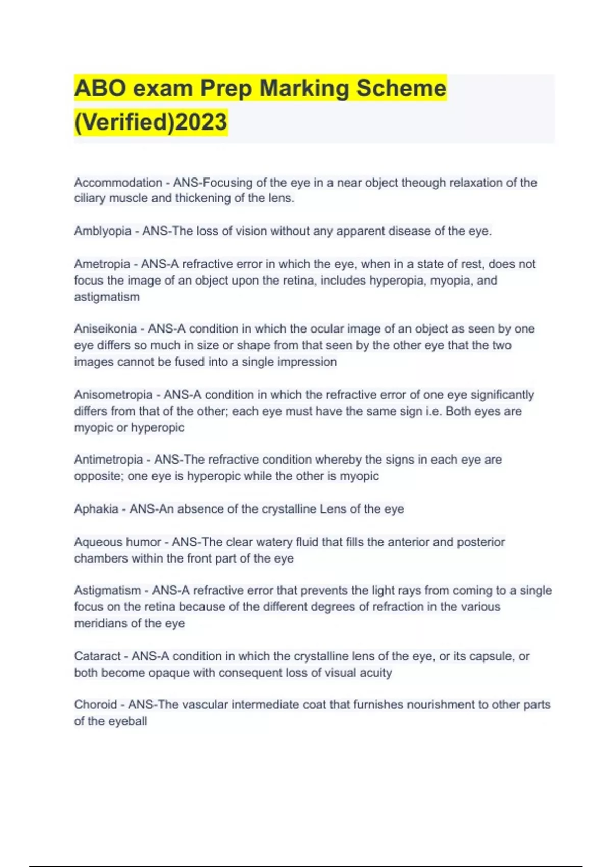 ABO exam Prep Marking Scheme (Verified)2023