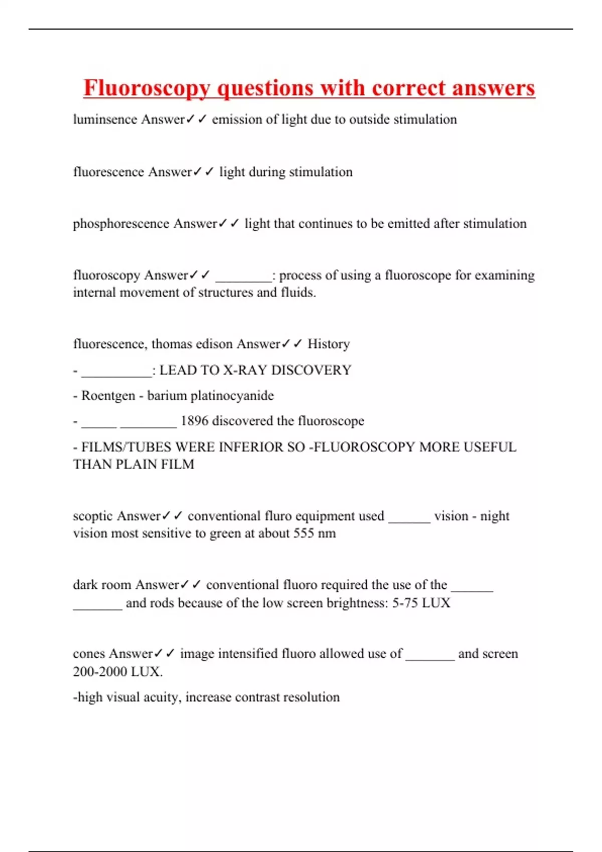 luminsence Answer emission of light due to outside stimulation fluorescence Answer light during stimulation phosphorescence Answer light that continues to be emitted after stimulation fluoroscopy Answer ________: process of using a fluoroscope for examining internal movement of structures and fluids. fluorescence, thomas edison Answer History - __________: LEAD TO X-RAY DISCOVERY - Roentgen - barium platinocyanide - _____ ________ 1896 discovered the fluoroscope - FILMS/TUBES WERE INFERIOR SO -FLUOROSCOPY MORE USEFUL THAN PLAIN FILM scoptic Answer conventional fluro equipment used ______ vision - night vision most sensitive to green at about 555 nm dark room Answer conventional fluoro required the use of the ______ _______ and rods because of the low screen brightness: 5-75 LUX cones Answer image intensified fluoro allowed use of _______ and screen 200-2000 LUX.
