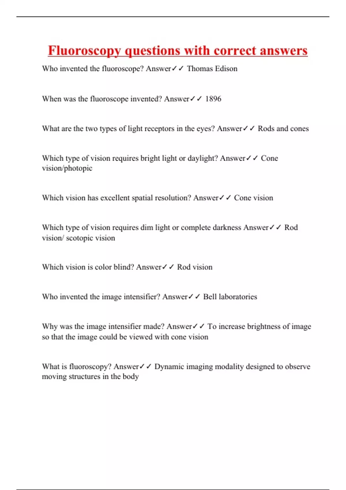 Who invented the fluoroscope? Answer Thomas Edison When was the fluoroscope invented? Answer 1896 What are the two types of light receptors in the eyes? Answer Rods and cones Which type of vision requires bright light or daylight? Answer Cone vision/photopic Which vision has excellent spatial resolution? Answer Cone vision Which type of vision requires dim light or complete darkness Answer Rod vision/ scotopic vision Which vision is color blind? Answer Rod vision Who invented the image intensifier? Answer Bell laboratories Why was the image intensifier made? Answer To increase brightness of image so that the image could be viewed with cone vision What is fluoroscopy? Answer Dynamic imaging modality designed to observe moving structures in the body