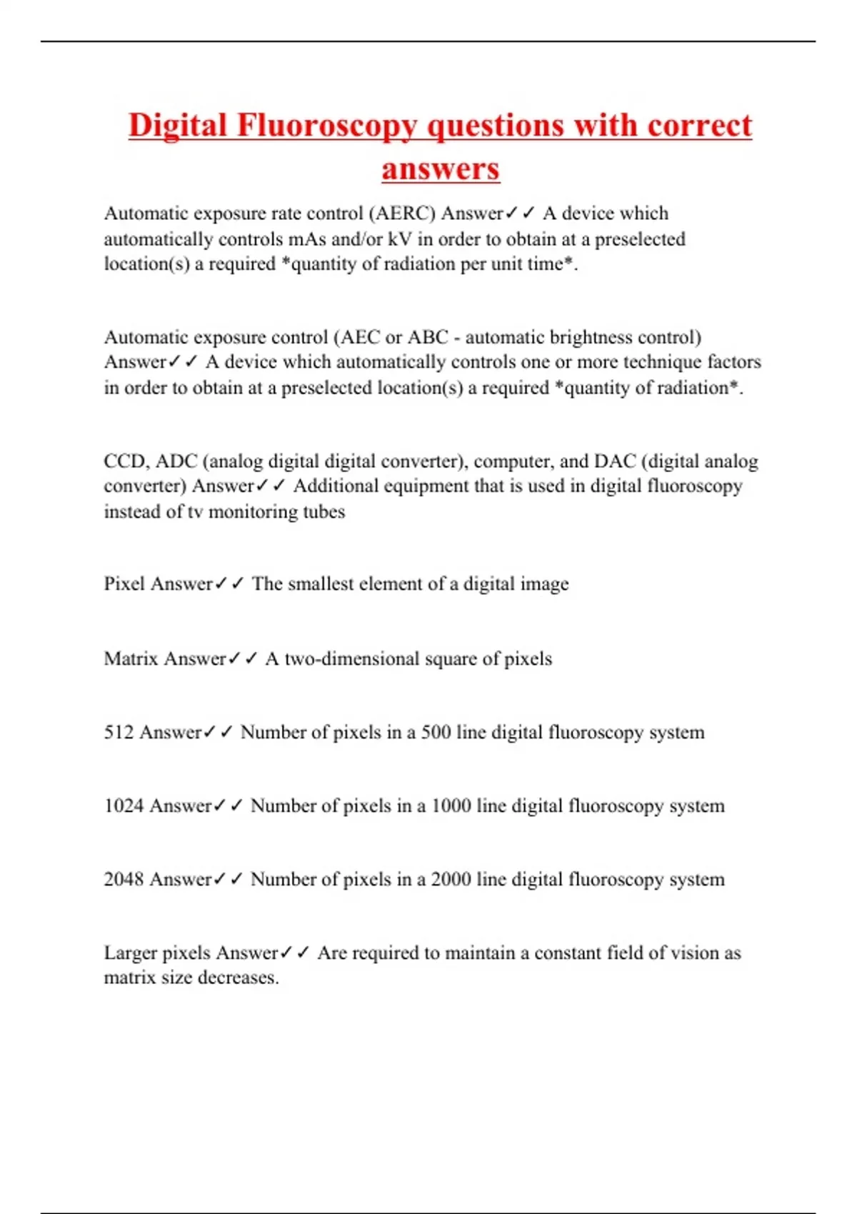 Automatic exposure rate control (AERC) Answer A device which automatically controls mAs and/or kV in order to obtain at a preselected location(s) a required *quantity of radiation per unit time*. Automatic exposure control (AEC or ABC - automatic brightness control) Answer A device which automatically controls one or more technique factors in order to obtain at a preselected location(s) a required *quantity of radiation*. CCD, ADC (analog digital digital converter), computer, and DAC (digital analog converter) Answer Additional equipment that is used in digital fluoroscopy instead of tv monitoring tubes Pixel Answer The smallest element of a digital image Matrix Answer A two-dimensional square of pixels 512 Answer Number of pixels in a 500 line digital fluoroscopy system 1024 Answer Number of pixels in a 1000 line digital fluoroscopy system 2048 Answer Number of pixels in a 2000 line digital fluoroscopy system Larger pixels Answer Are required to maintain a constant field of vision as matrix size decreases.