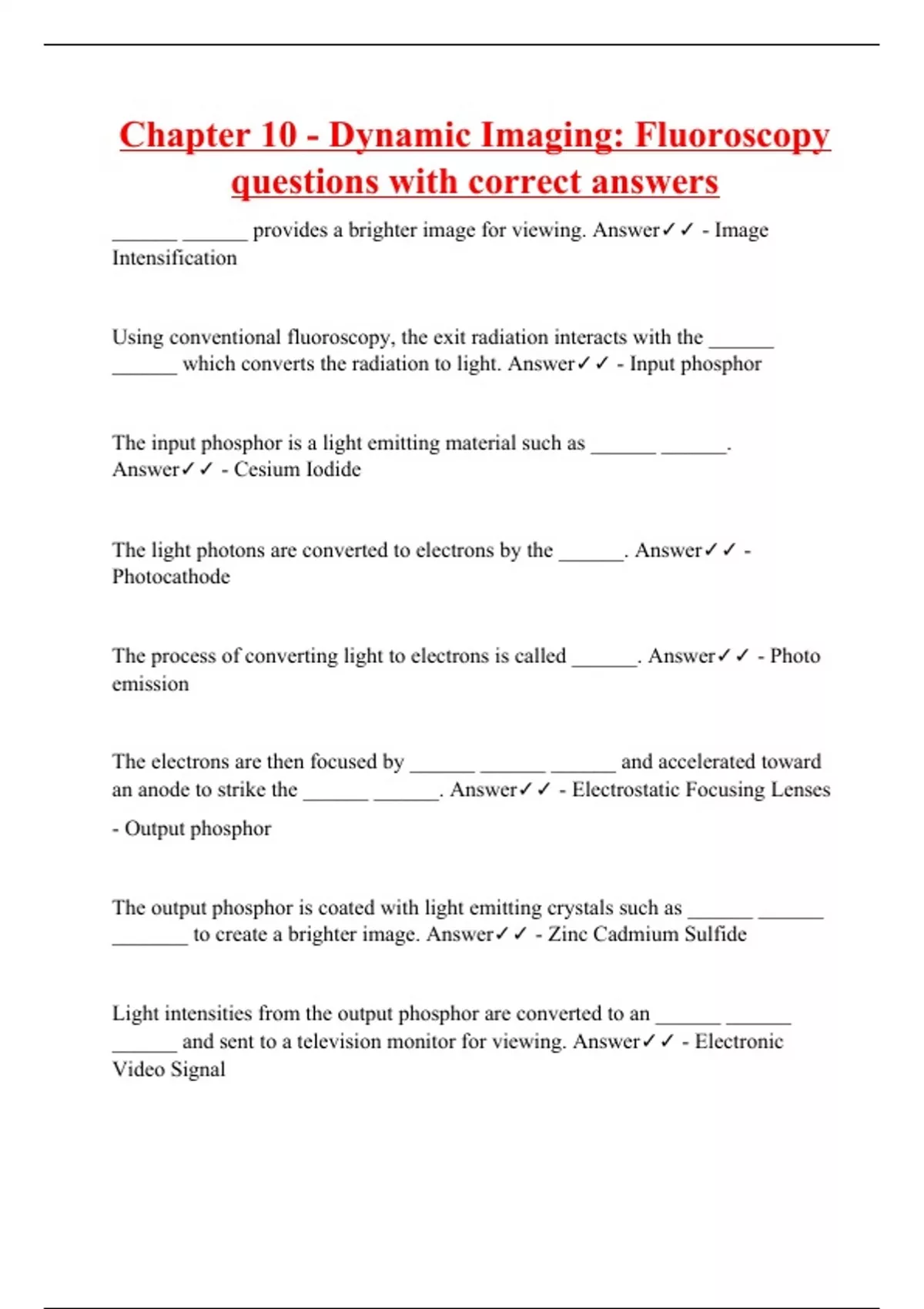 Chapter 10 - Dynamic Imaging: Fluoroscopy questions with correct answers
