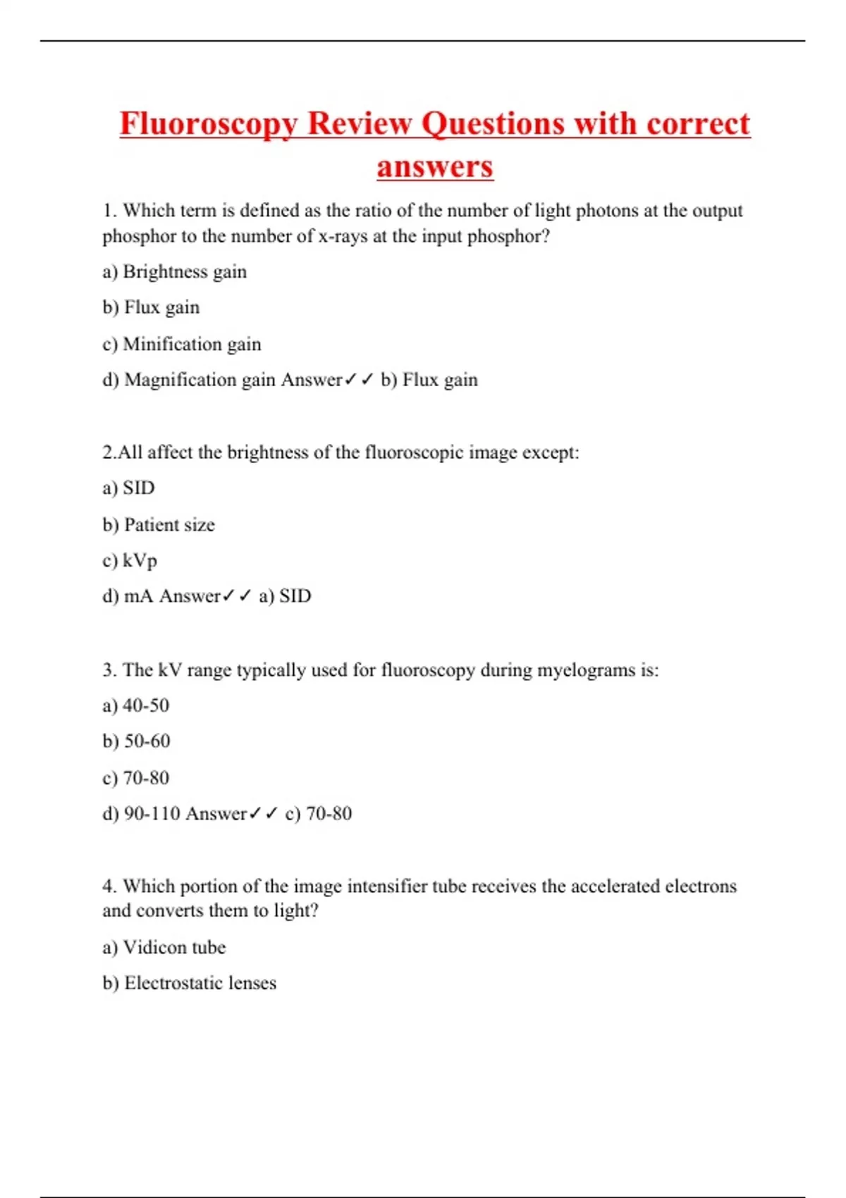 1. Which term is defined as the ratio of the number of light photons at the output phosphor to the number of x-rays at the input phosphor? a) Brightness gain b) Flux gain c) Minification gain d) Magnification gain Answer b) Flux gain 2.All affect the brightness of the fluoroscopic image except: a) SID b) Patient size c) kVp d) mA Answer a) SID 3. The kV range typically used for fluoroscopy during myelograms is: a) 40-50 b) 50-60 c) 70-80 d) 90-110 Answer c) 70-80 4. Which portion of the image intensifier tube receives the accelerated electrons and converts them to light? a) Vidicon tube b) Electrostatic lenses