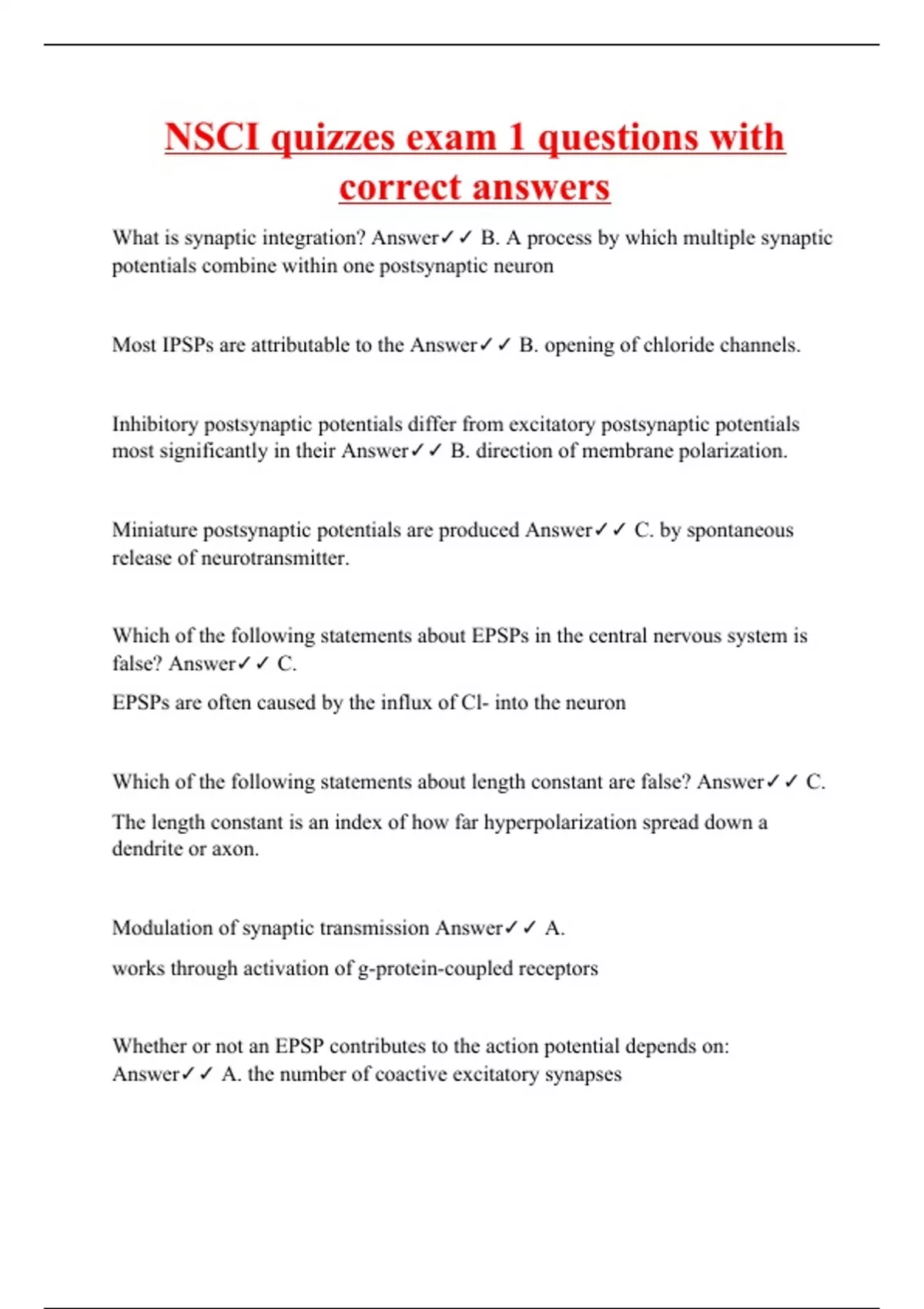 What is synaptic integration? Answer B. A process by which multiple synaptic potentials combine within one postsynaptic neuron Most IPSPs are attributable to the Answer B. opening of chloride channels. Inhibitory postsynaptic potentials differ from excitatory postsynaptic potentials most significantly in their Answer B. direction of membrane polarization. Miniature postsynaptic potentials are produced Answer C. by spontaneous release of neurotransmitter. Which of the following statements about EPSPs in the central nervous system is false? Answer C. EPSPs are often caused by the influx of Cl- into the neuron Which of the following statements about length constant are false? Answer C. The length constant is an index of how far hyperpolarization spread down a dendrite or axon. Modulation of synaptic transmission Answer A. works through activation of g-protein-coupled receptors Whether or not an EPSP contributes to the action potential depends on: Answer A. the number of coactive excitatory synapses